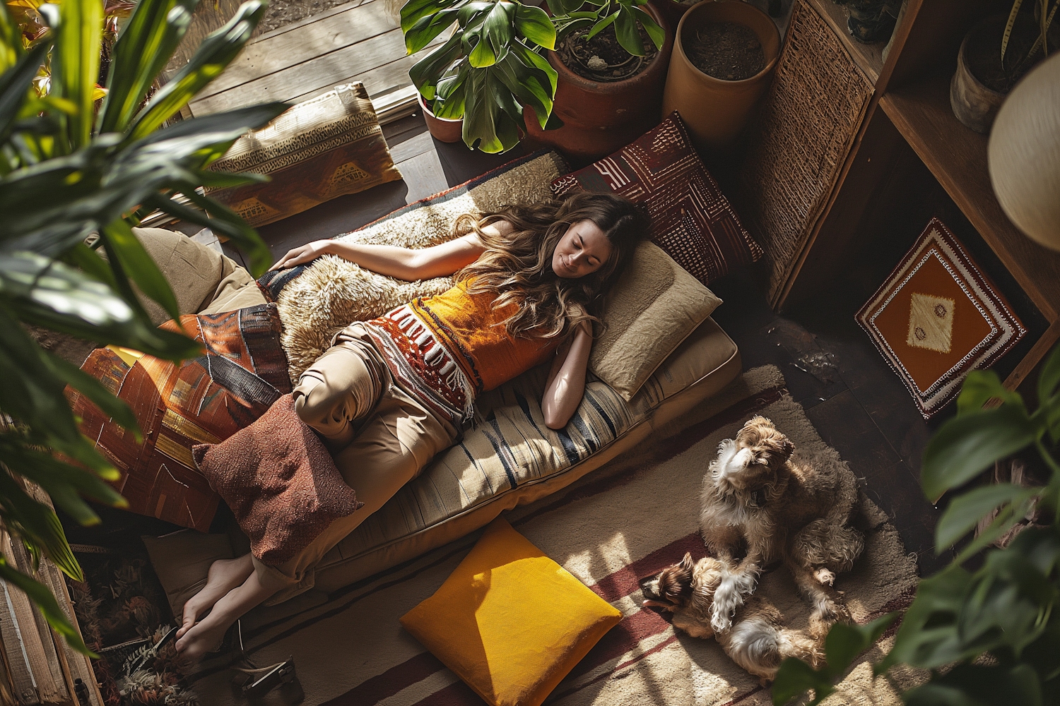 Bohemian Bliss: Serene Woman with Loyal Companions