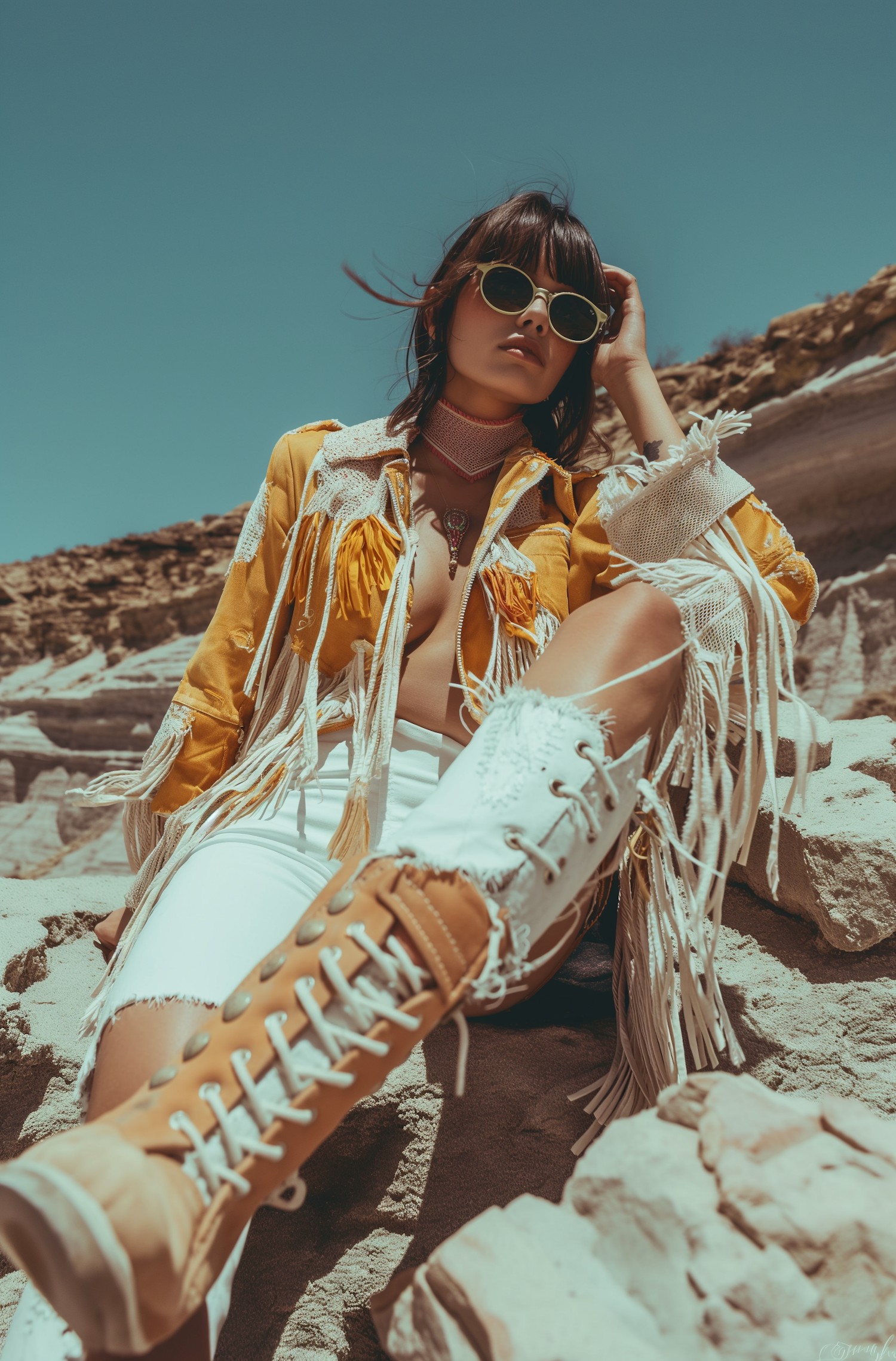 Stylish woman in fringe jacket and boots poses on rocky terrain under a clear sky, exuding a bohemian vibe.