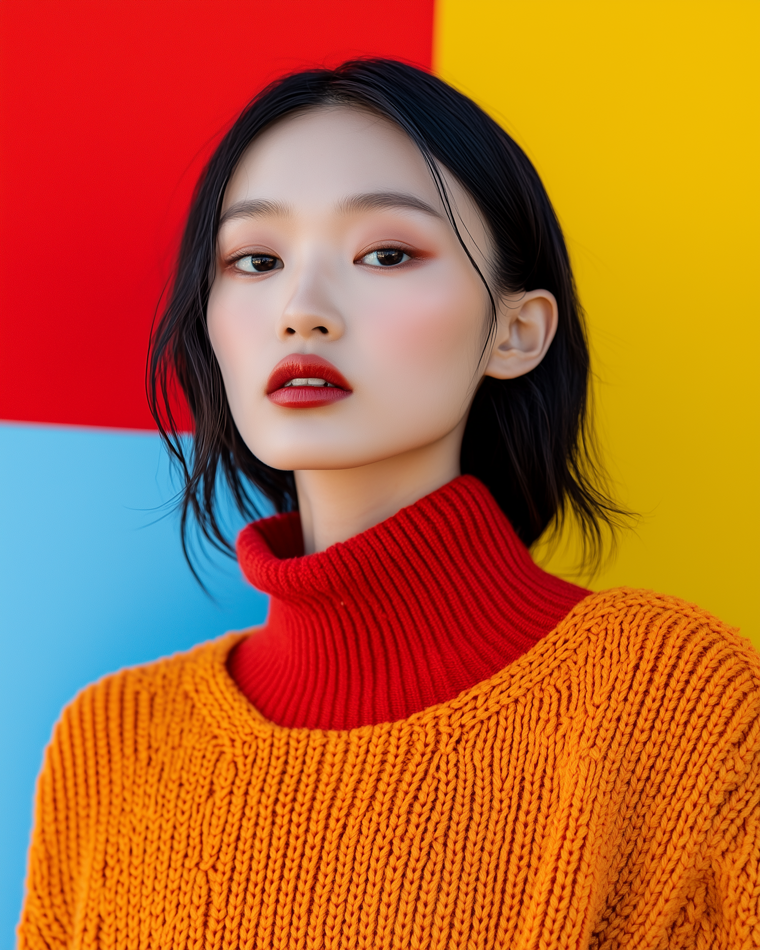 Asian woman in red and orange attire against a colorful background, showcasing bold makeup and a confident expression.