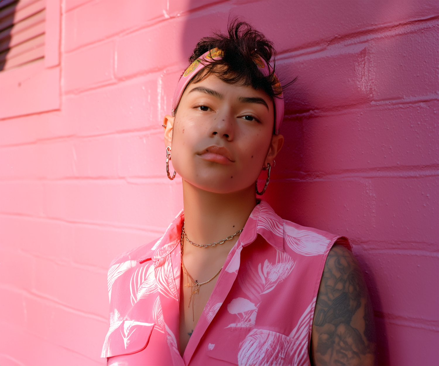 Person with short hair and pink headband against a pink wall, wearing a floral shirt and hoop earrings. Vibrant and stylish portrait.
