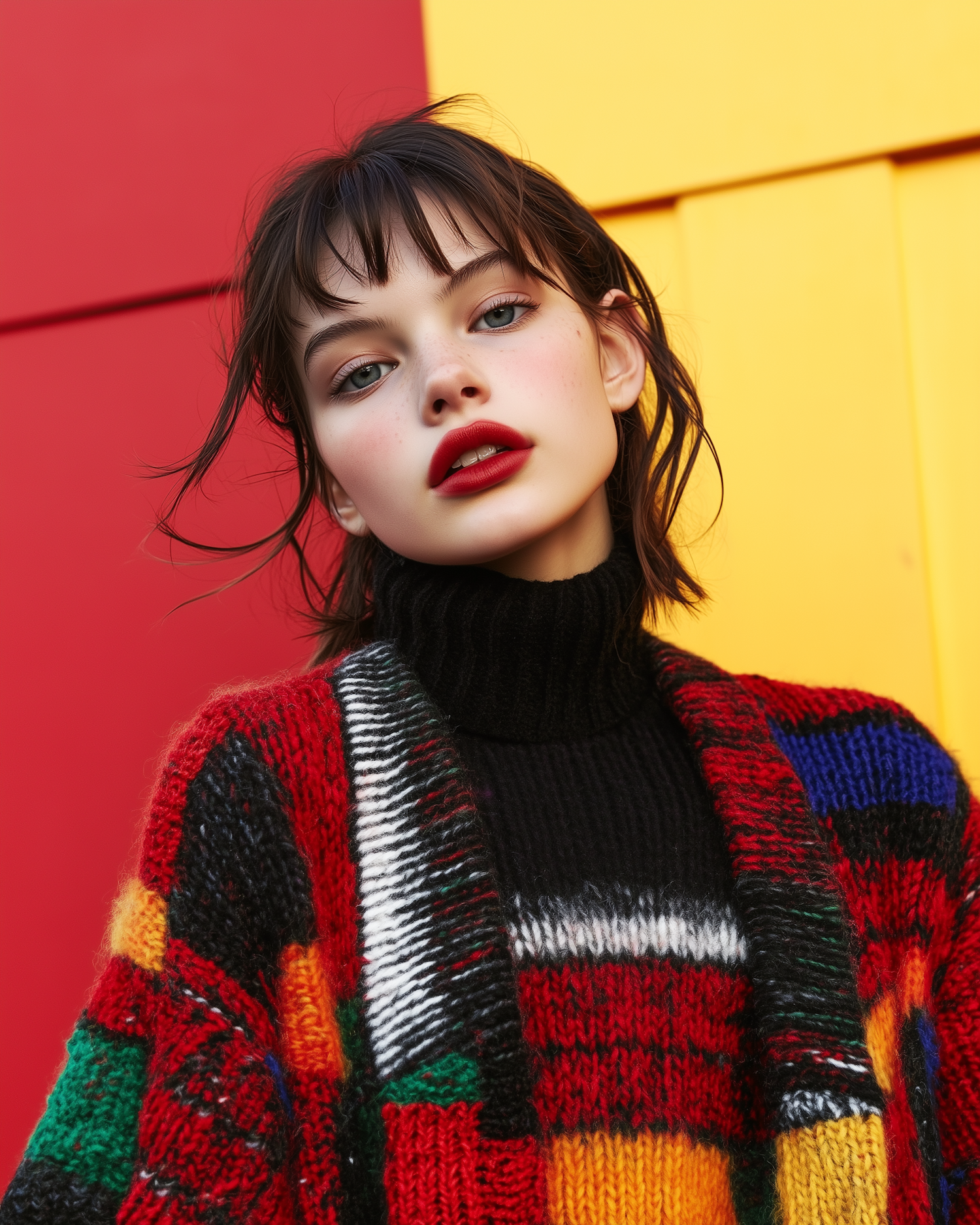 Young woman in colorful knit sweater against vibrant red and yellow background, showcasing bold fashion and striking makeup.