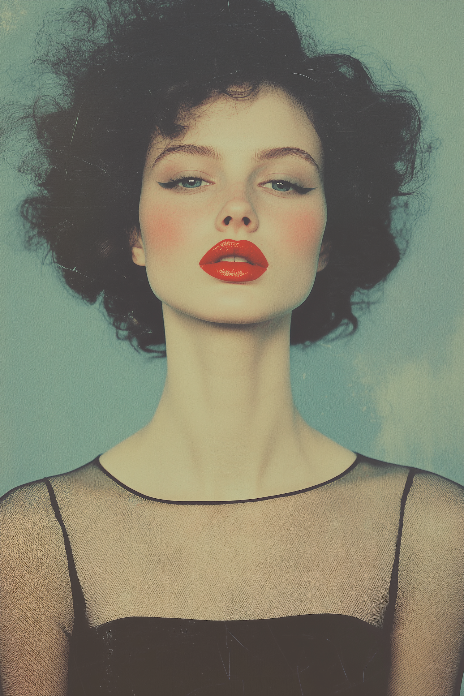 Bold portrait of a woman with red lips, dramatic eyeliner, and voluminous black hair against a muted teal background.