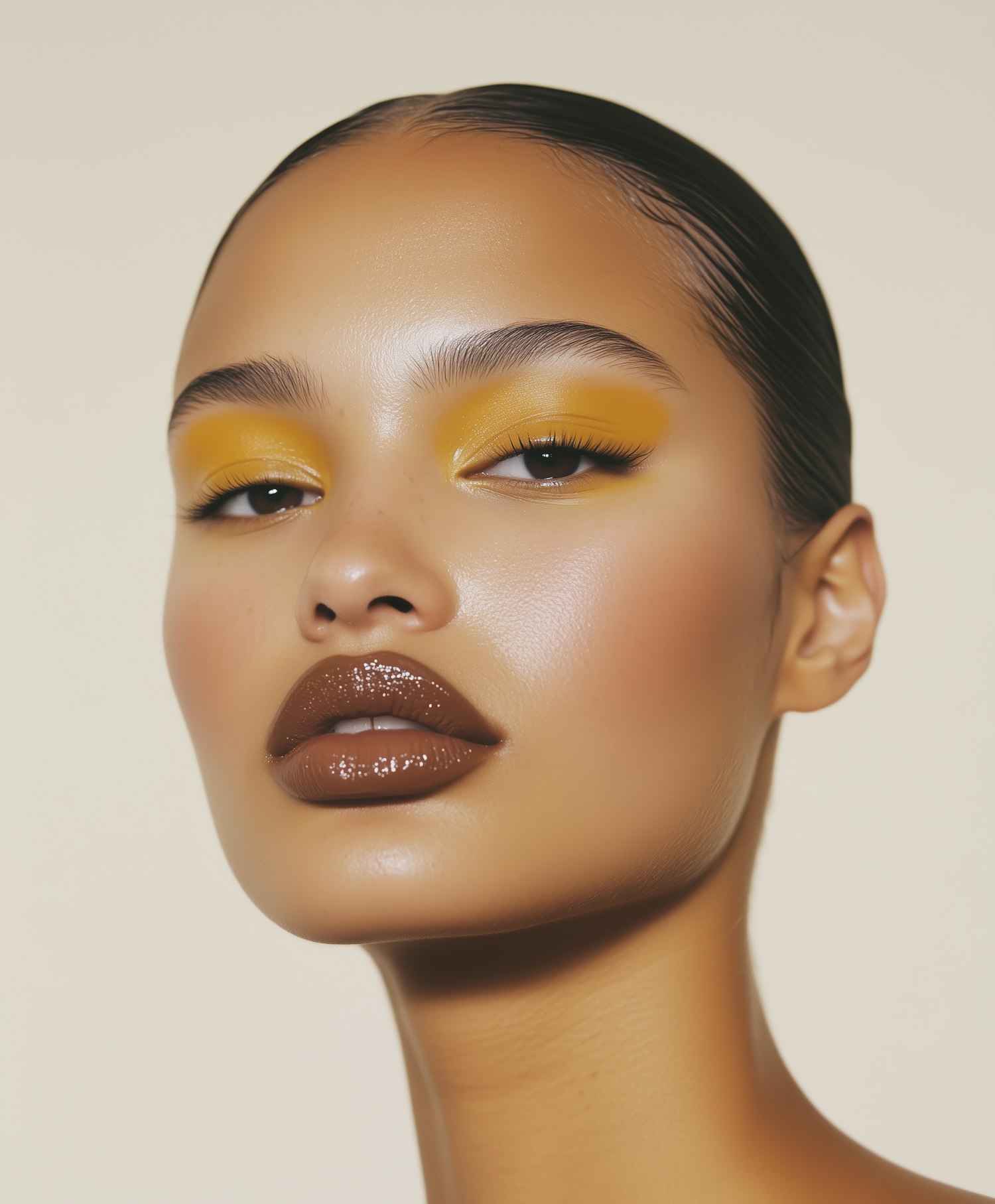 Close-up of a woman with yellow eyeshadow and glossy brown lips, showcasing a bold and elegant makeup look.