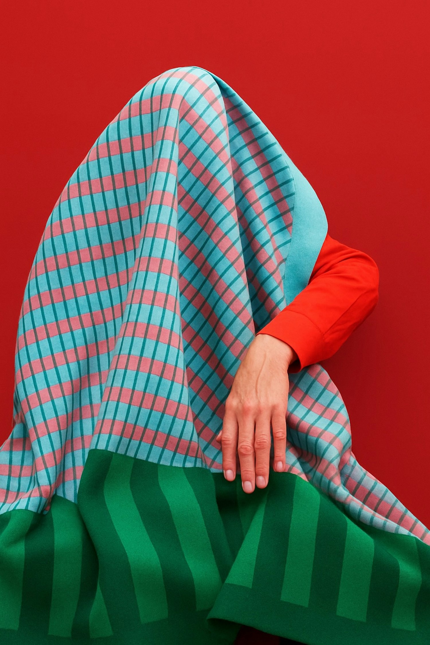 A vibrant composition featuring a person draped in colorful patterned fabric against a bold red background, emphasizing modern design.