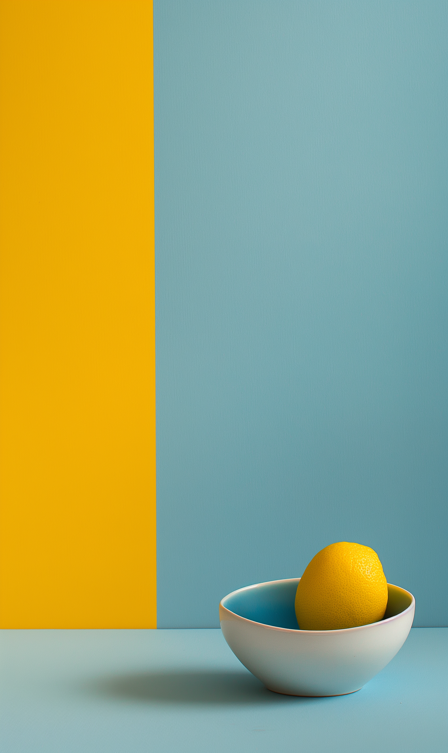 Minimalist scene with a lemon in a blue bowl against a yellow and blue background, highlighting bold color contrasts.