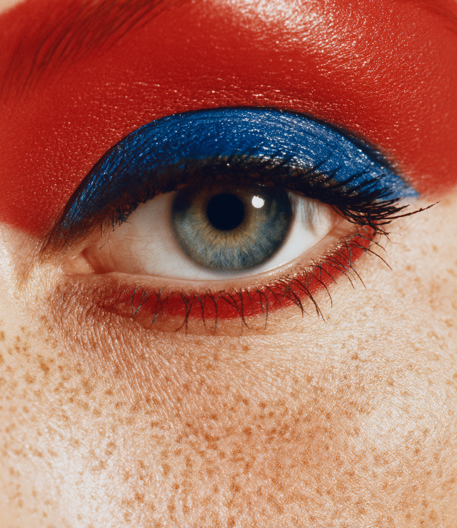 A striking close-up features an eye with bold red and blue makeup, freckles on skin add texture.