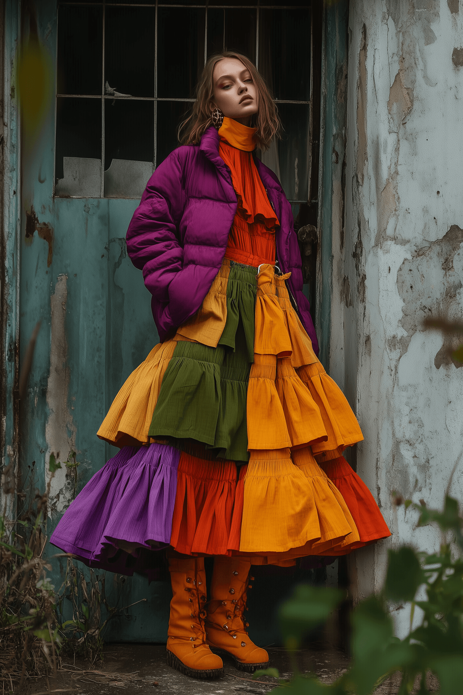 Vibrant fashion scene with a woman in a colorful layered skirt and purple jacket against a rustic teal door.
