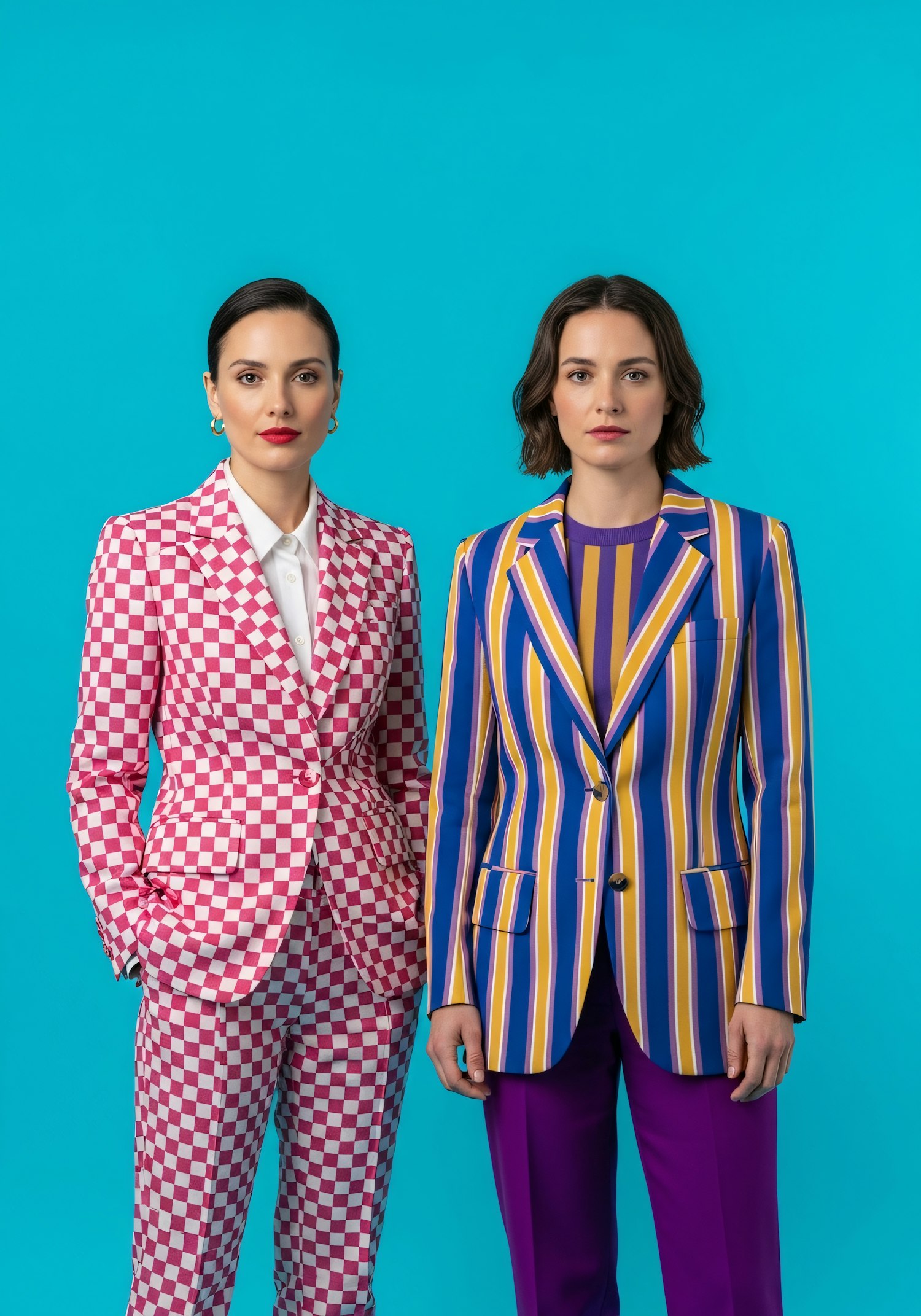 Two women in vibrant patterned suits stand against a turquoise background, showcasing bold fashion choices and confident expressions.