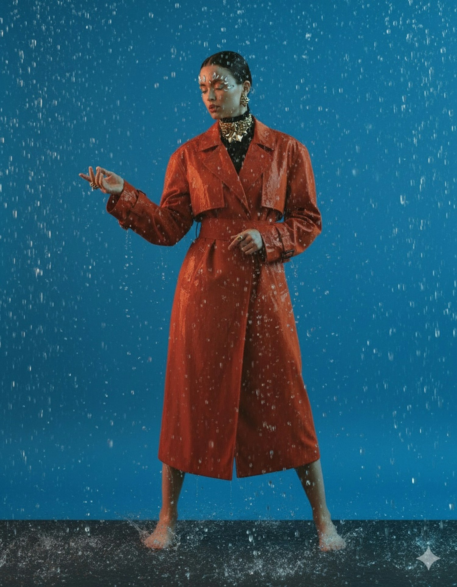 A striking fashion shot of a person in an orange trench coat under simulated rain, set against a vivid blue background.