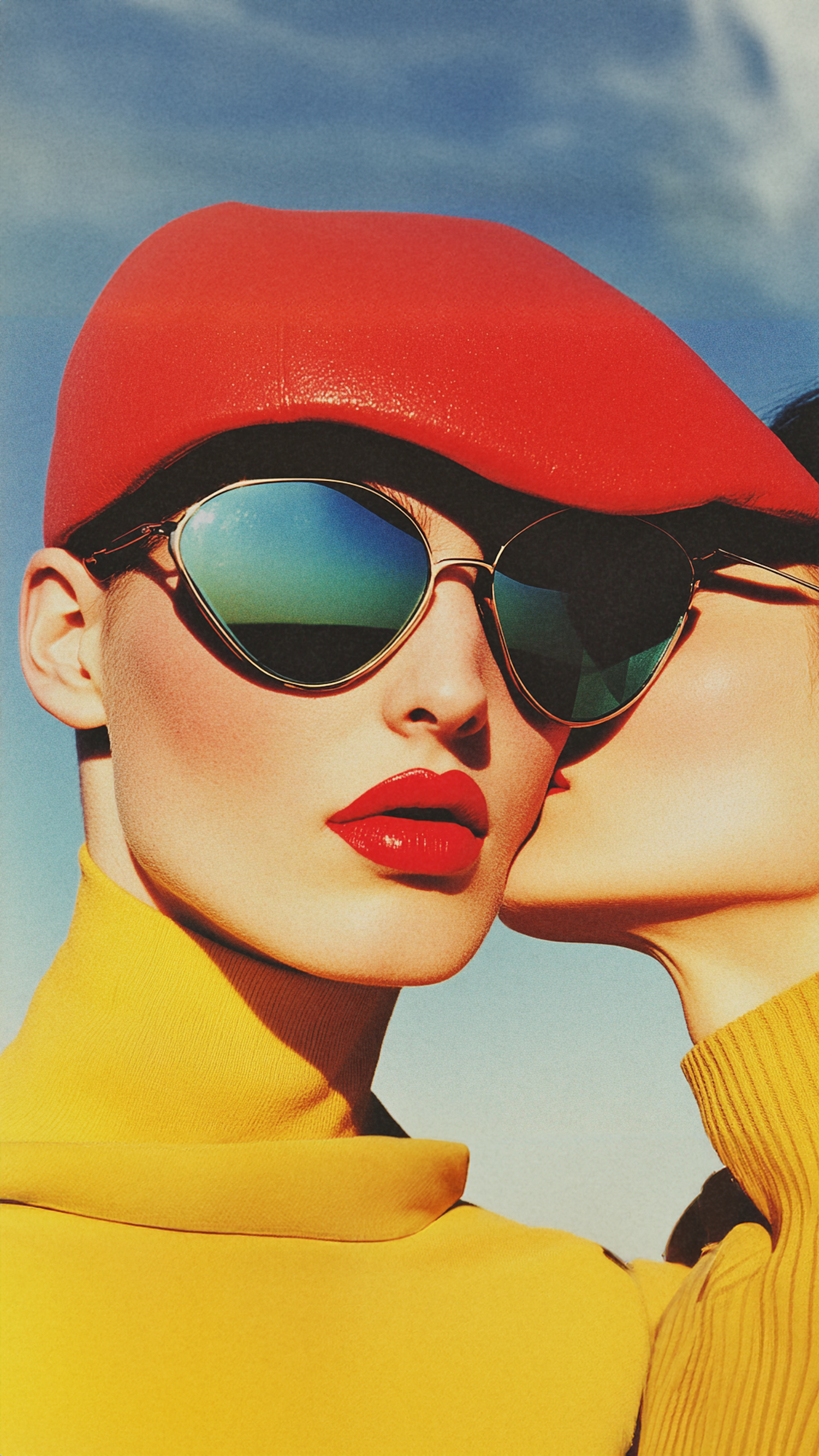 Bold fashion shot with reflective aviators, red hat, and yellow turtleneck against a clear blue sky. Vibrant colors and modern style.