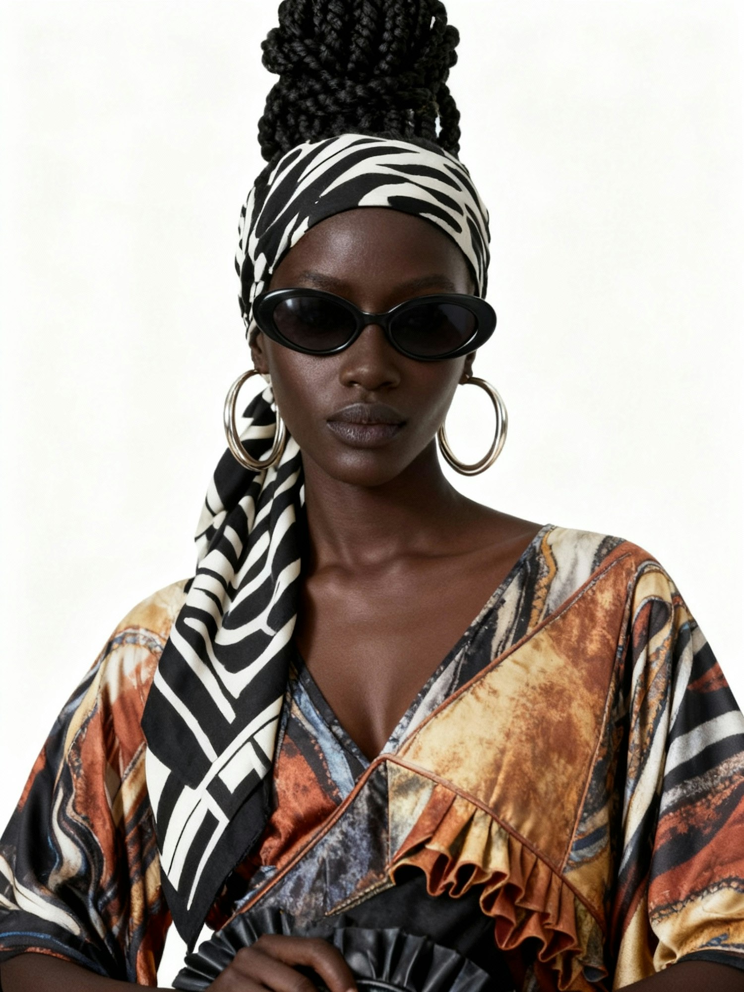 Stylish portrait of a woman in a patterned headscarf, bold sunglasses, and a vibrant patchwork outfit with ruffled details.