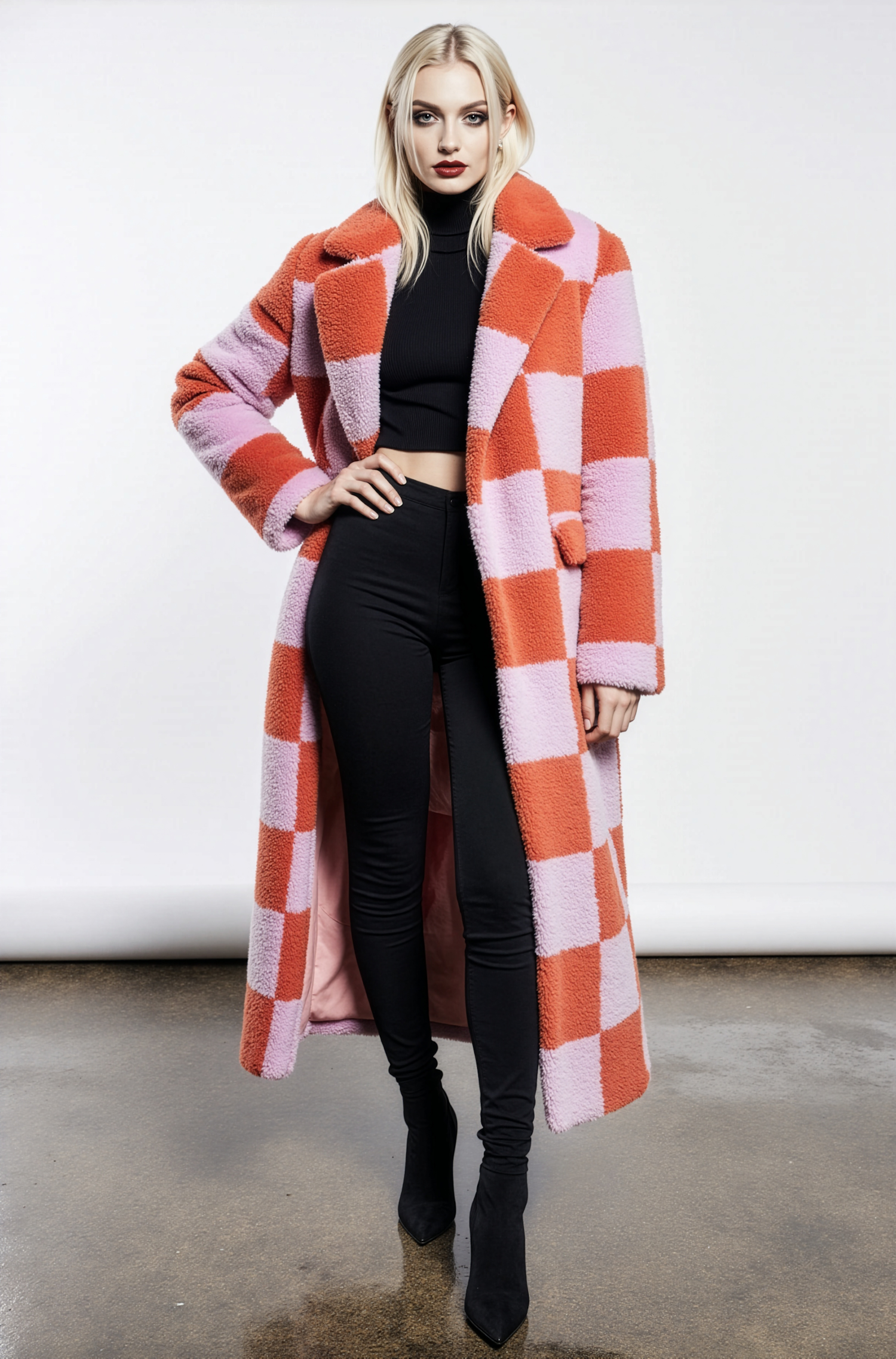 A stylish woman in a bold orange and pink checkered coat, black crop top, and leggings, posing confidently in a studio setting.