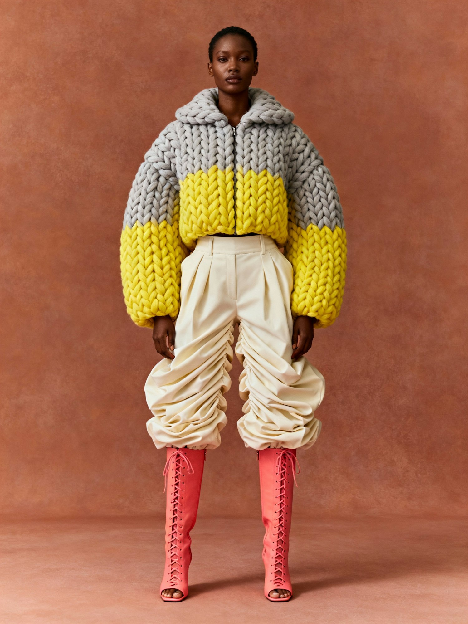 A confident woman standing against a plain background that complements her warm brown skin tone, wearing a voluminous, braided-texture jacket with alternating sections of gray and bright yellow. She pairs it with sculptural cream-colored high-waisted pants featuring exaggerated folds and pleats. Her footwear consists of coral pink open-toe lace-up boots that extend to the knees, adding a bold pop of color and intricate detail. The look is avant-garde and artistic, blending innovative textile design with runway-level drama and expressive color blocking.