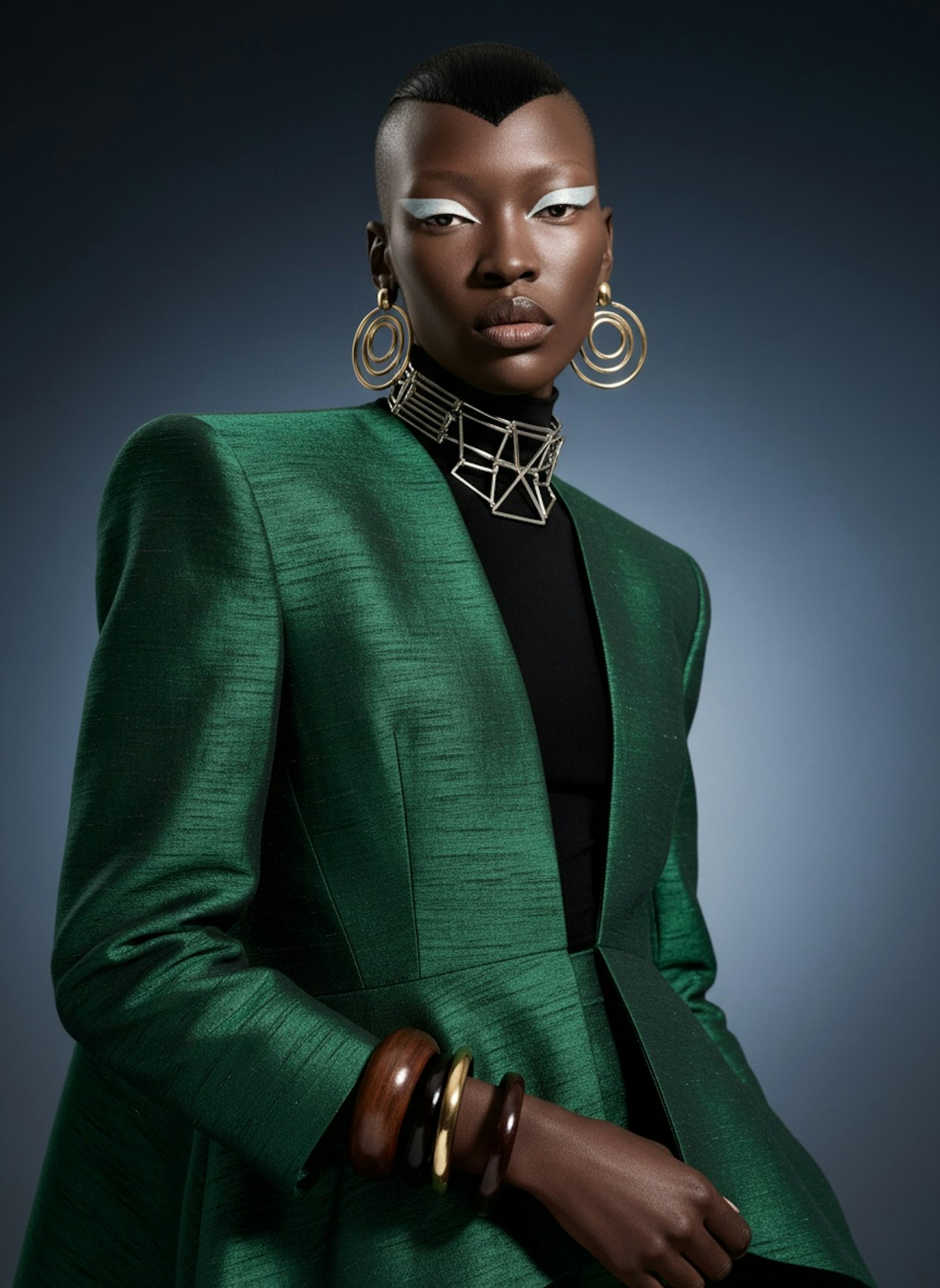 A bold fashion portrait featuring a person in a green jacket, geometric jewelry, and dramatic makeup against a dark blue background.