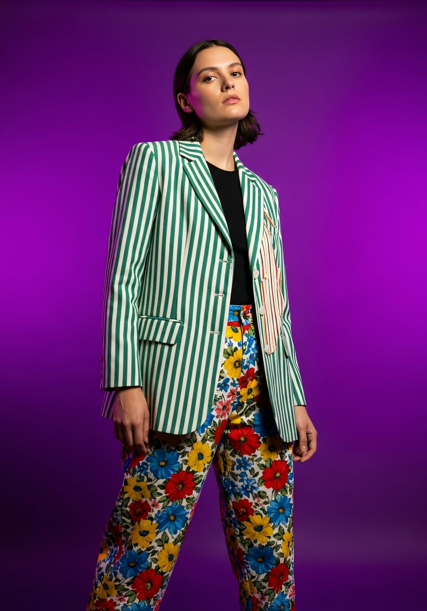 A stylish individual in a striped blazer and floral pants stands confidently against a vibrant purple backdrop.