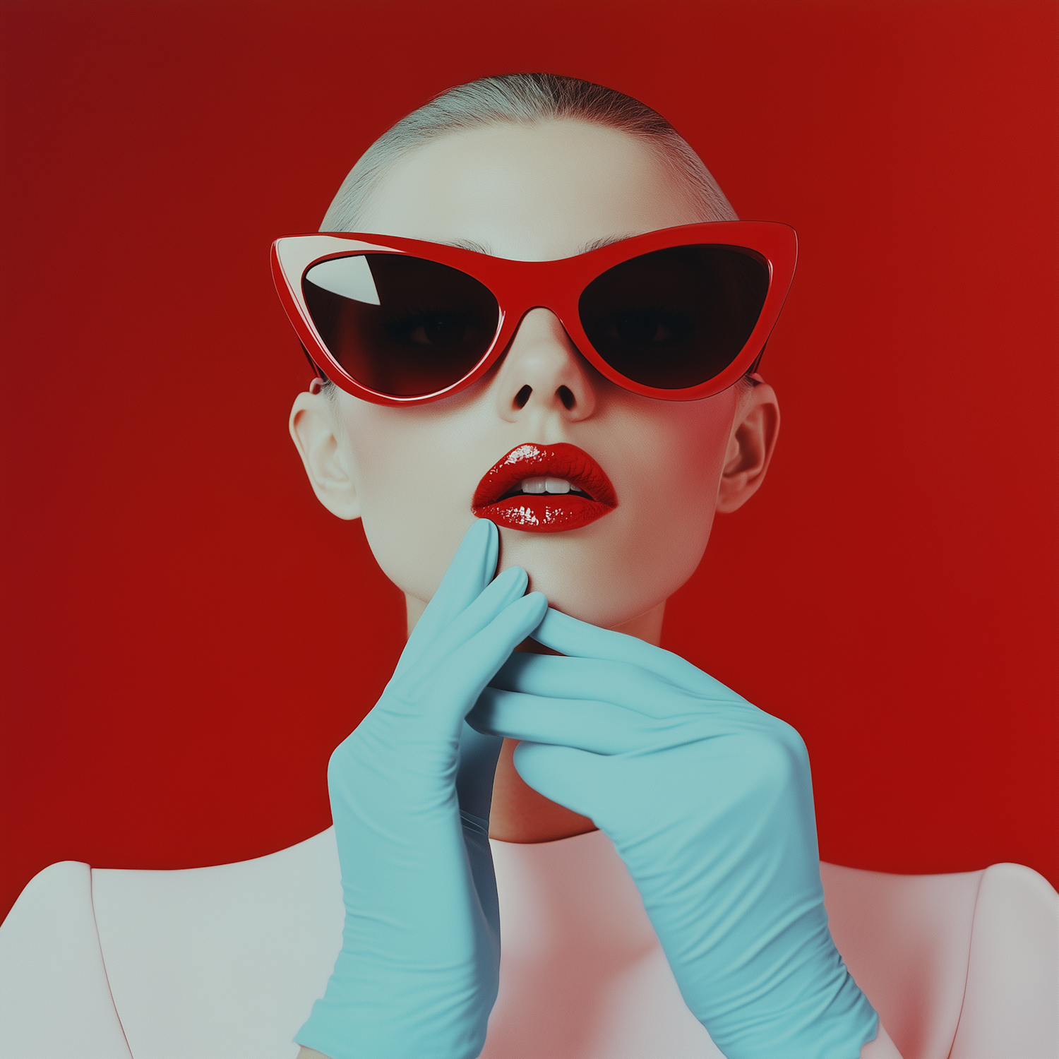 Stylish portrait with red sunglasses, glossy lips, and blue gloves against a vibrant red background. Fashion-forward and bold.