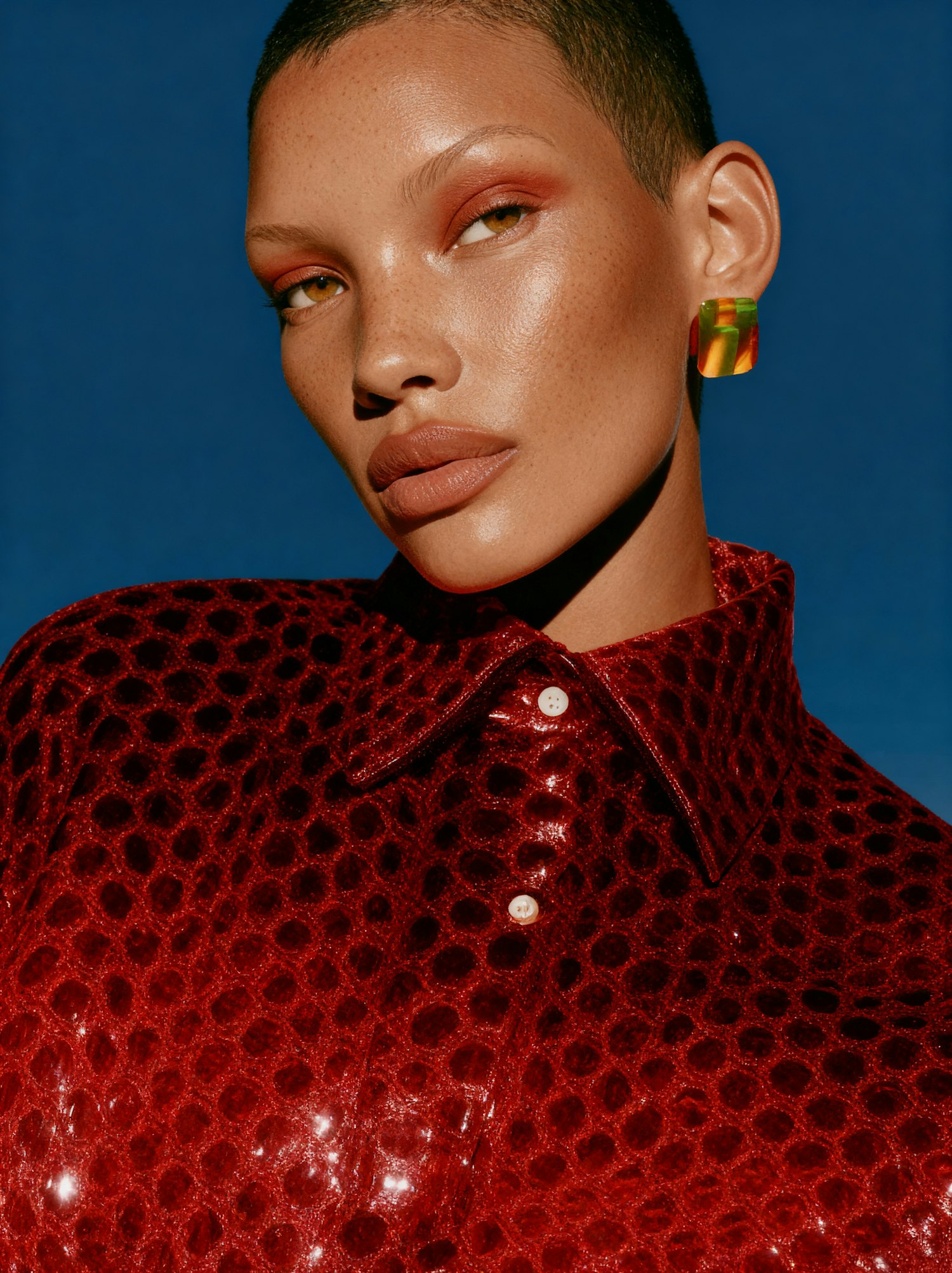 A striking portrait of a person in a red textured shirt, bold makeup, and colorful earrings against a vibrant blue background.