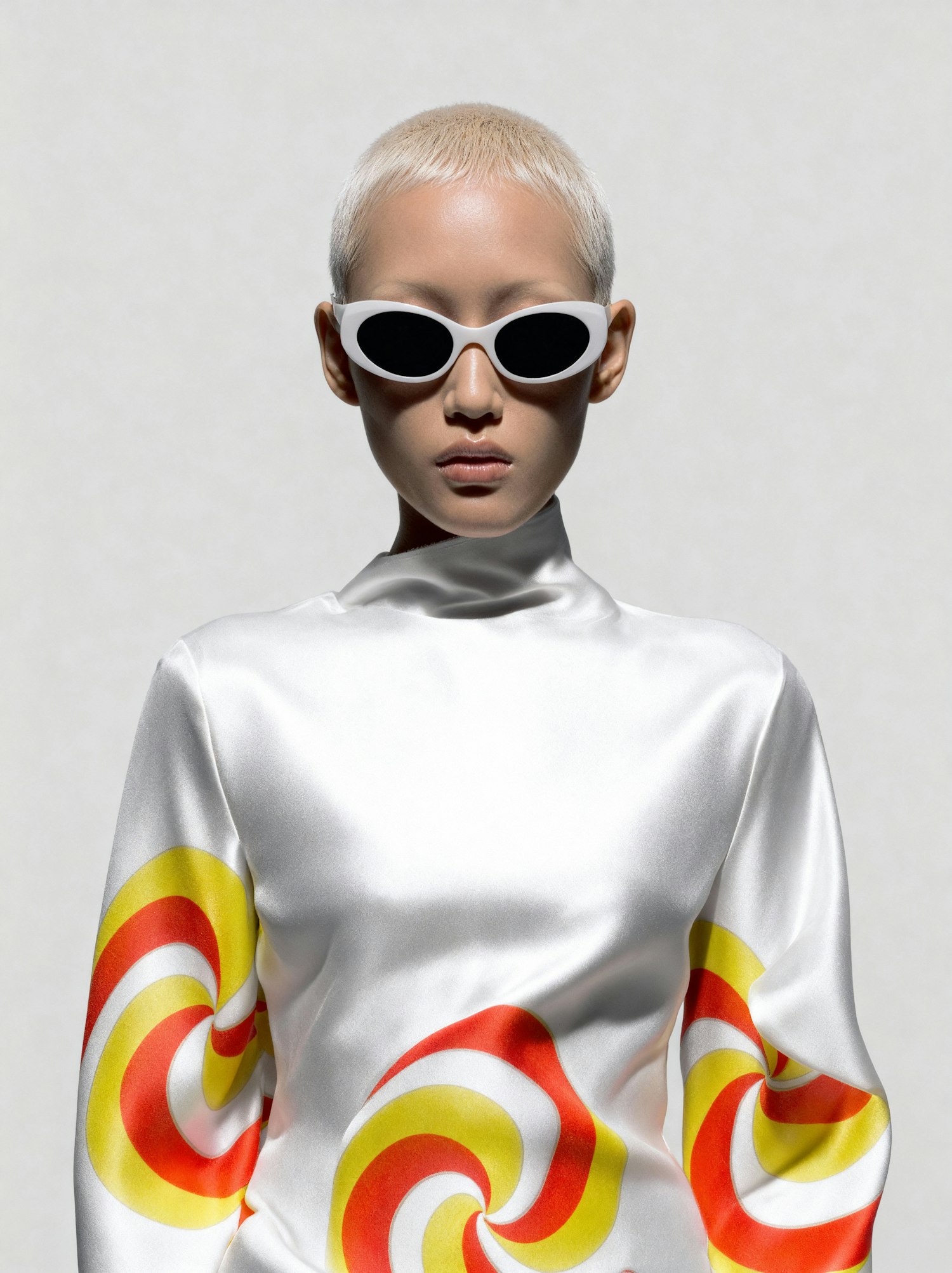 A stylish individual in a white satin top with vibrant patterns and white sunglasses, set against a neutral background.