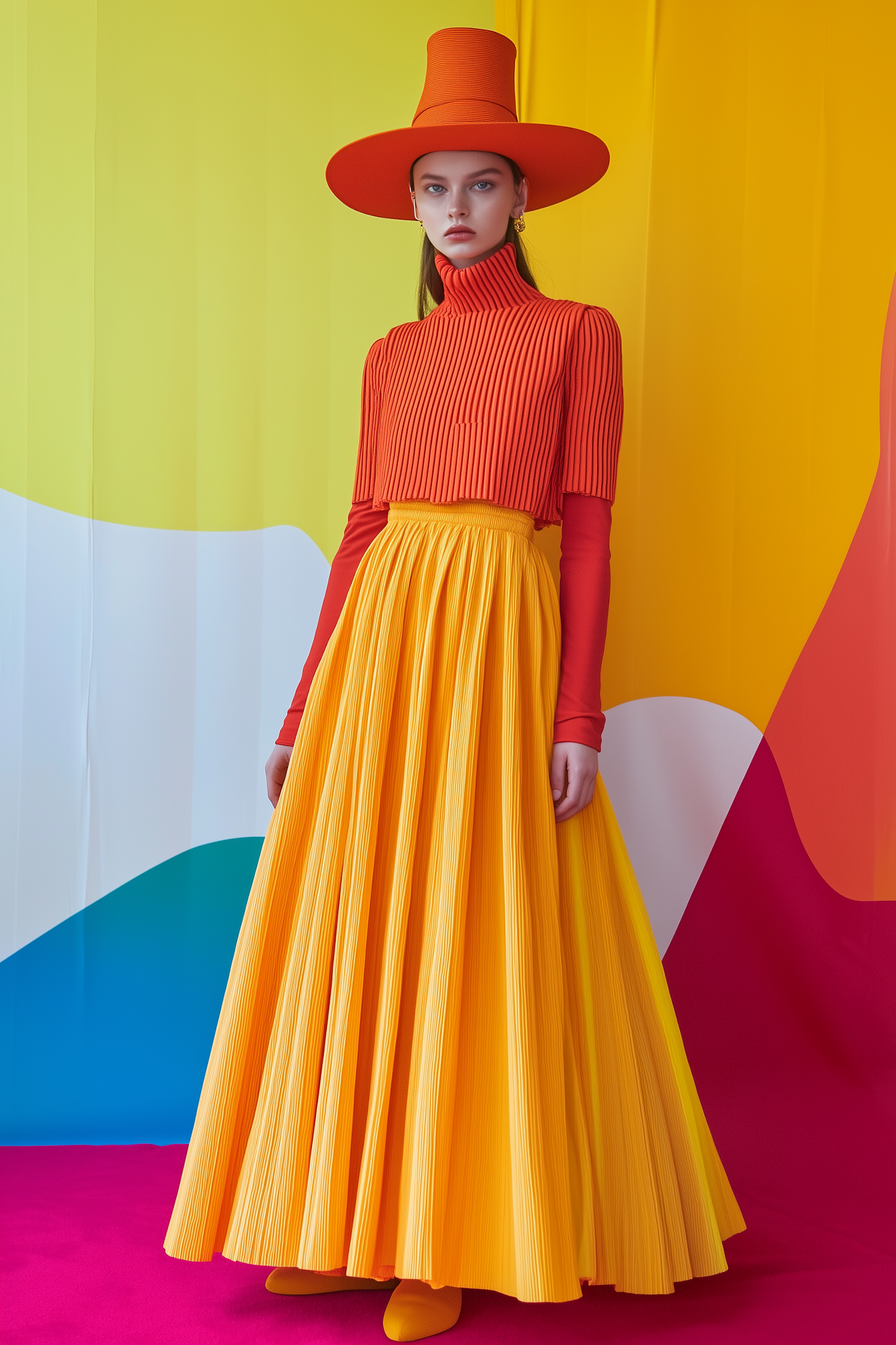 Bold fashion look with an orange hat, ribbed top, and yellow pleated skirt against a colorful abstract background. Vibrant and modern.