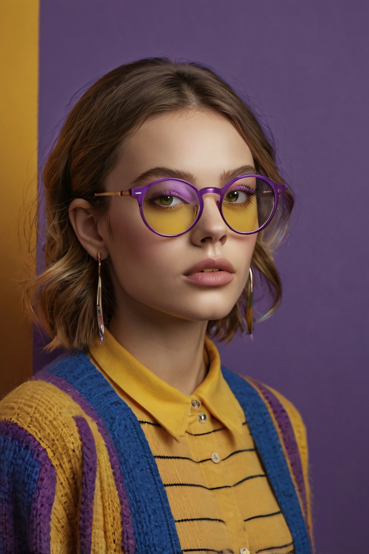 Stylish woman in purple glasses and vibrant yellow-blue outfit against a bold purple-yellow background.