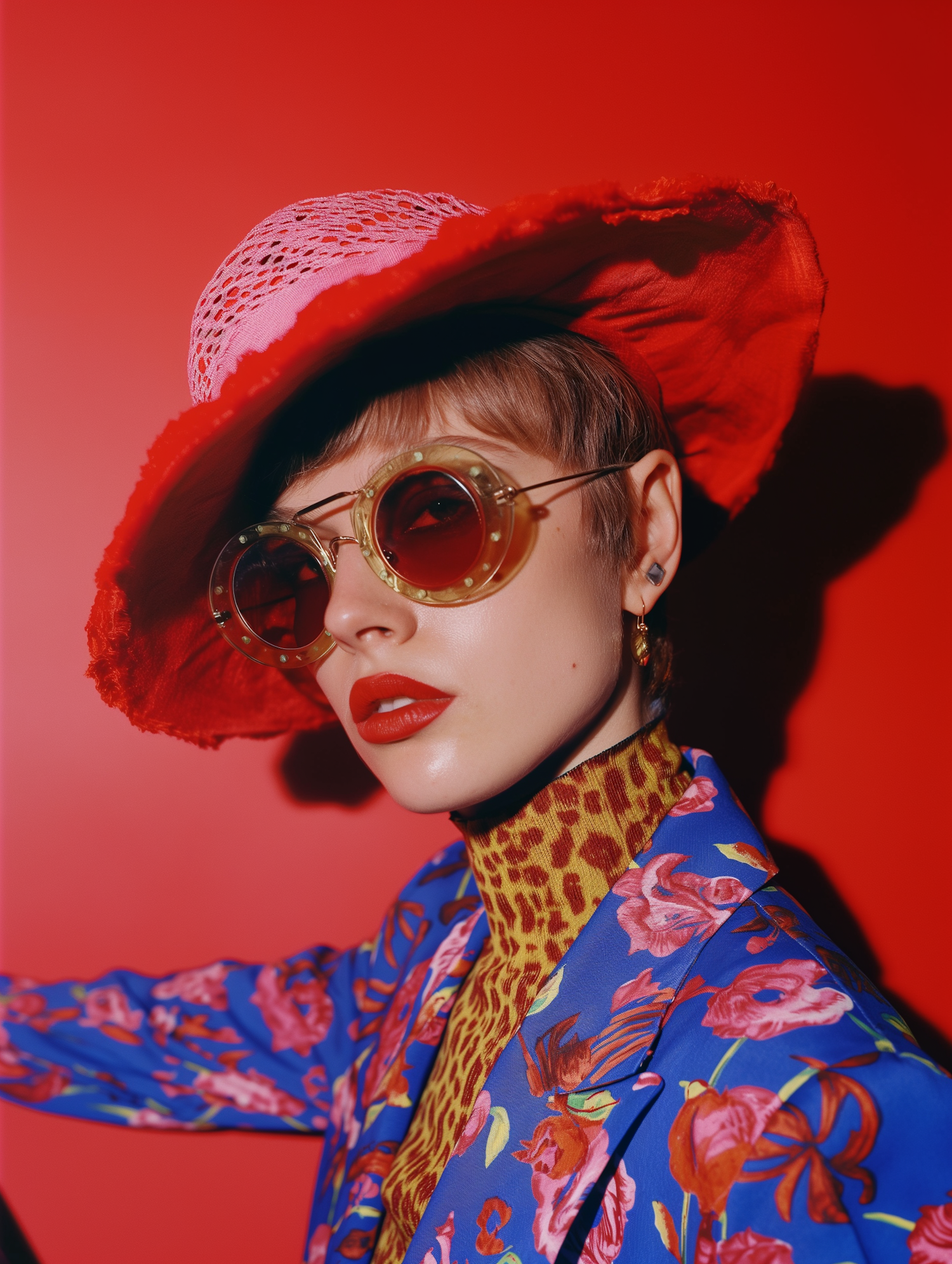Fashion-forward individual in red hat and floral jacket against a red backdrop, showcasing bold style and vibrant colors.