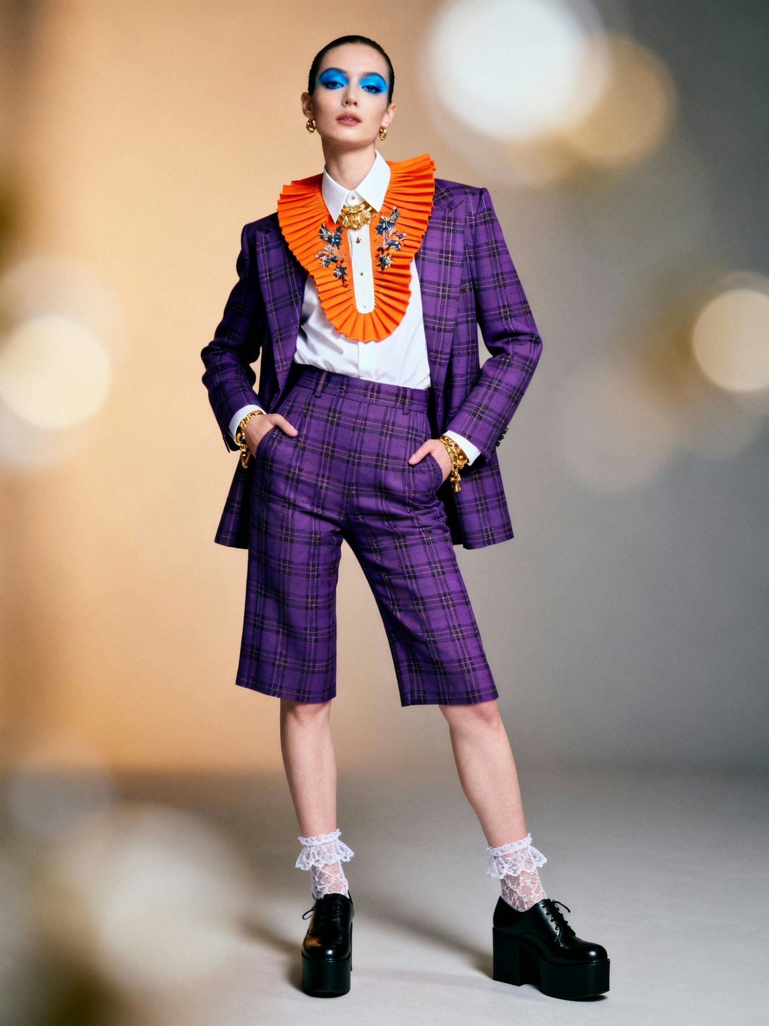 A stylish individual in a purple plaid suit with bold accessories and vibrant makeup, standing confidently against a blurred background.