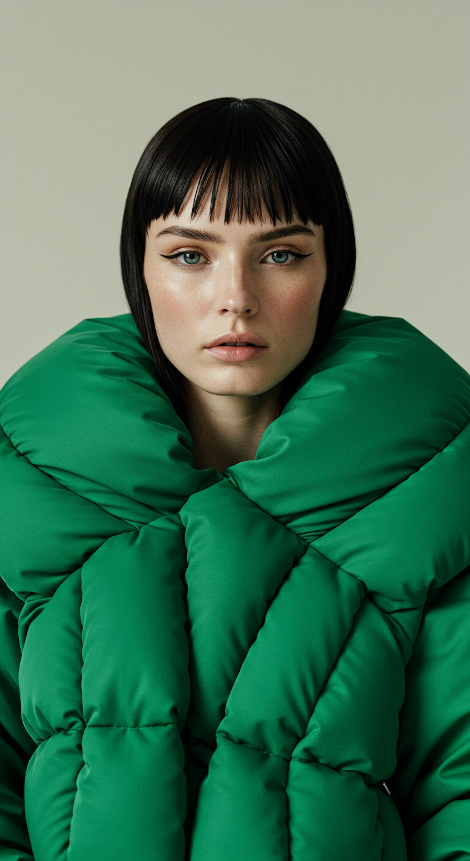 A woman in a bold green puffer jacket with short black hair and striking eyeliner stares directly at the camera against a beige background.