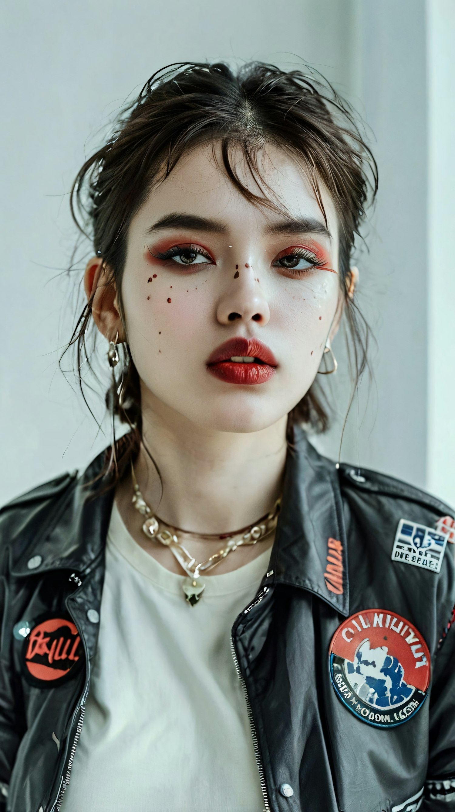 Asian woman with bold makeup and leather jacket, featuring red eyeshadow and decorative dots. Edgy style with layered necklaces.