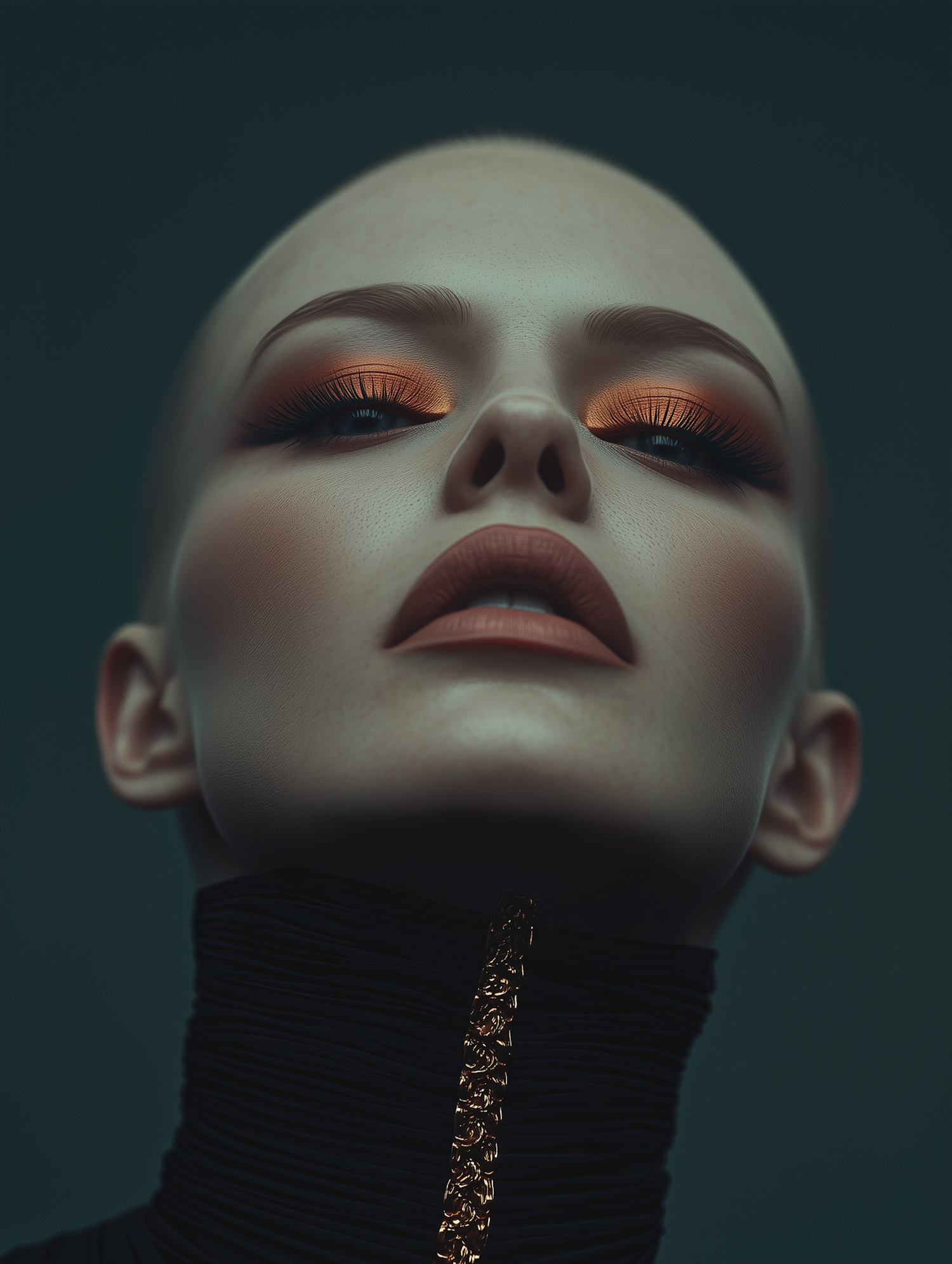 Close-up of a bald individual with bold orange eyeshadow, matte pink lips, and a textured black outfit with gold detail.