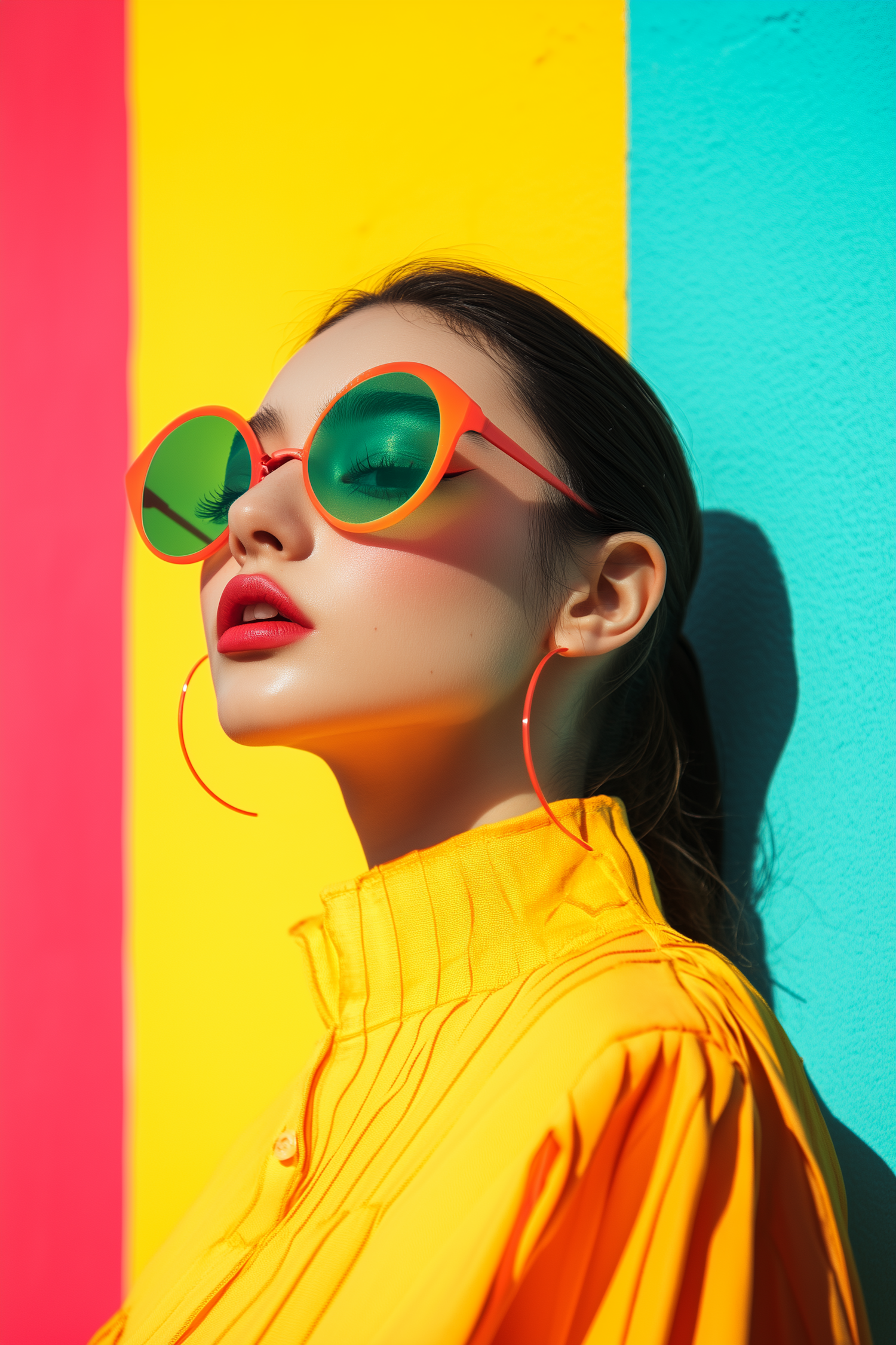 Bold fashion portrait with oversized sunglasses, vibrant yellow blouse, and colorful background. Perfect for modern style inspiration.
