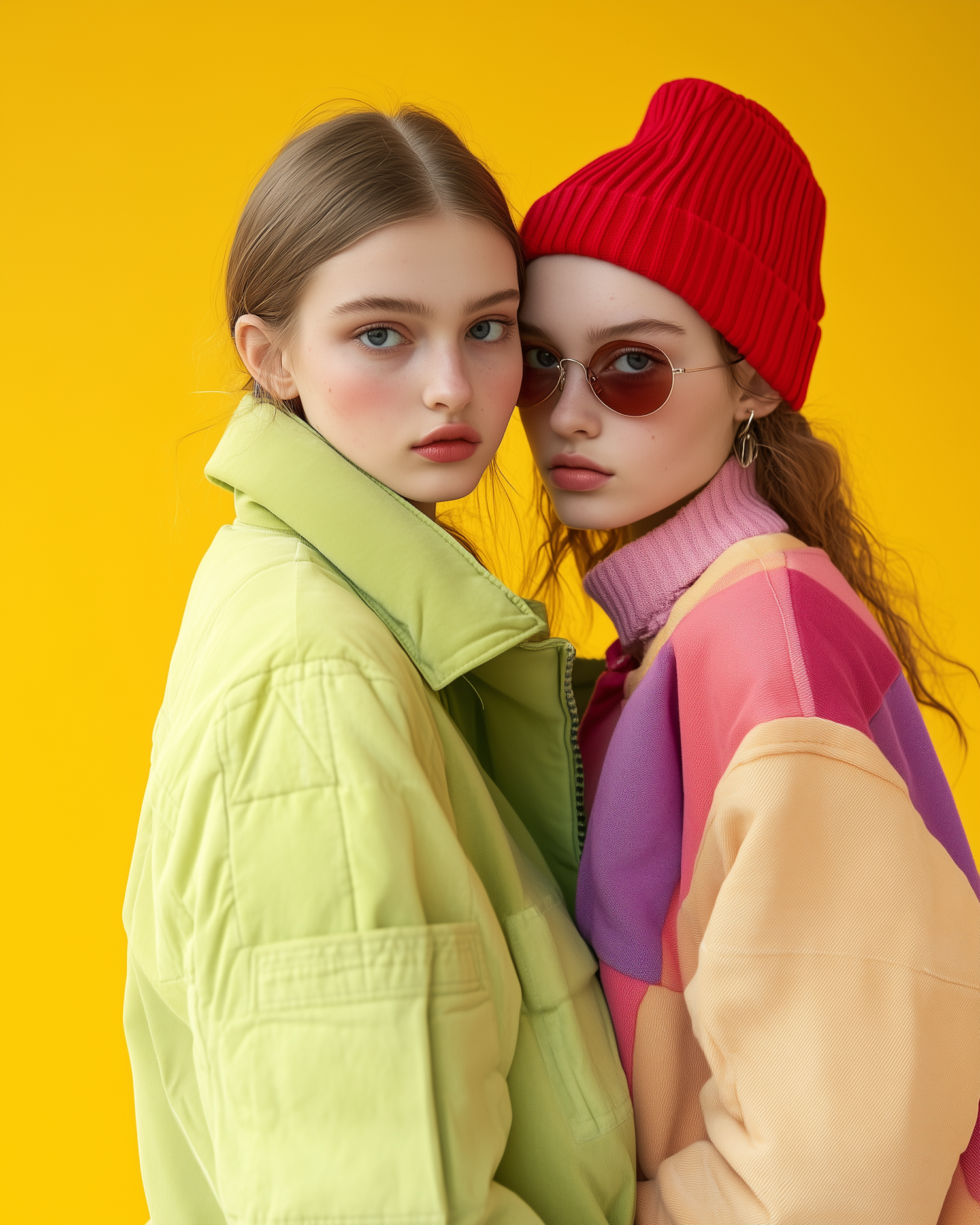 Two stylish women in colorful outfits pose against a bold yellow background, showcasing vibrant fashion and confident expressions.