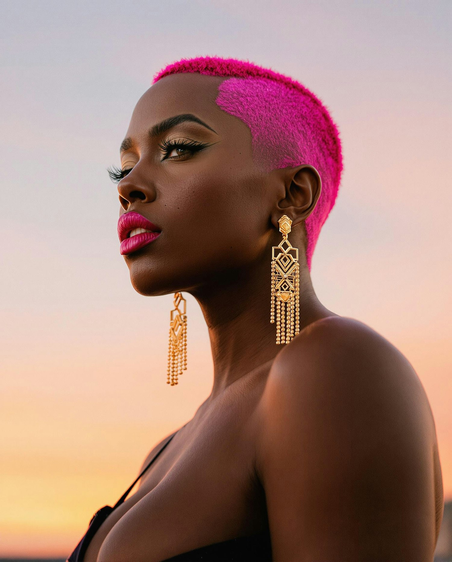 Bold portrait of a woman with a pink buzz cut, gold chandelier earrings, and dramatic makeup against a warm sunset backdrop.