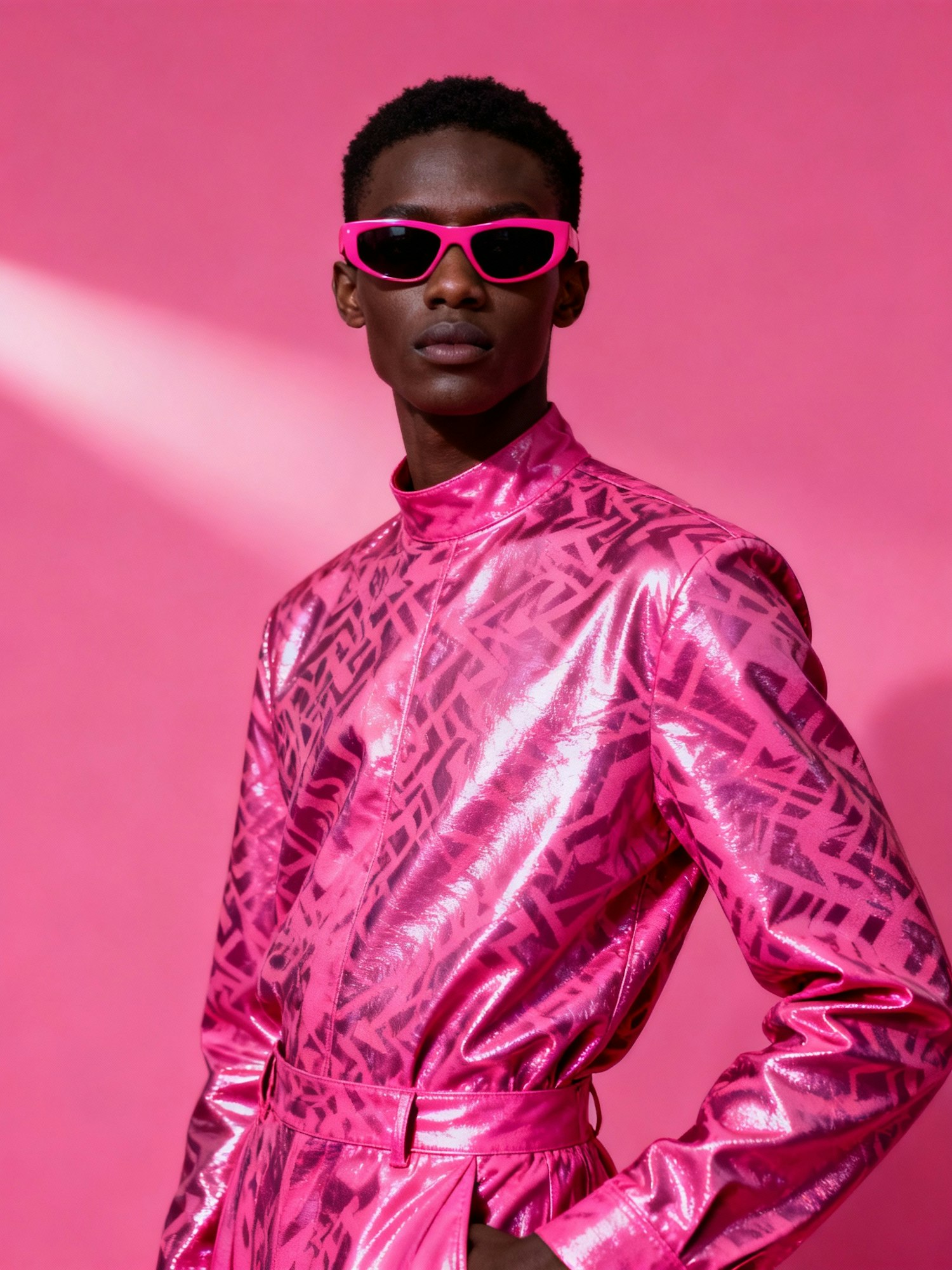 Cinematic, high-definition portrait of a stylish black individual in a shiny, patterned outfit in vibrant pink tones, including all clothing and accessories, standing against a matching pink background. Sleek sunglasses add a modern, edgy touch. Soft, directional lighting highlights the reflective textures and subtle folds of the outfit, while emphasizing depth and contours. The pose is confident and commanding, creating a cohesive, avant-garde, editorial aesthetic. Visually striking, fashion-forward, and monochromatic.