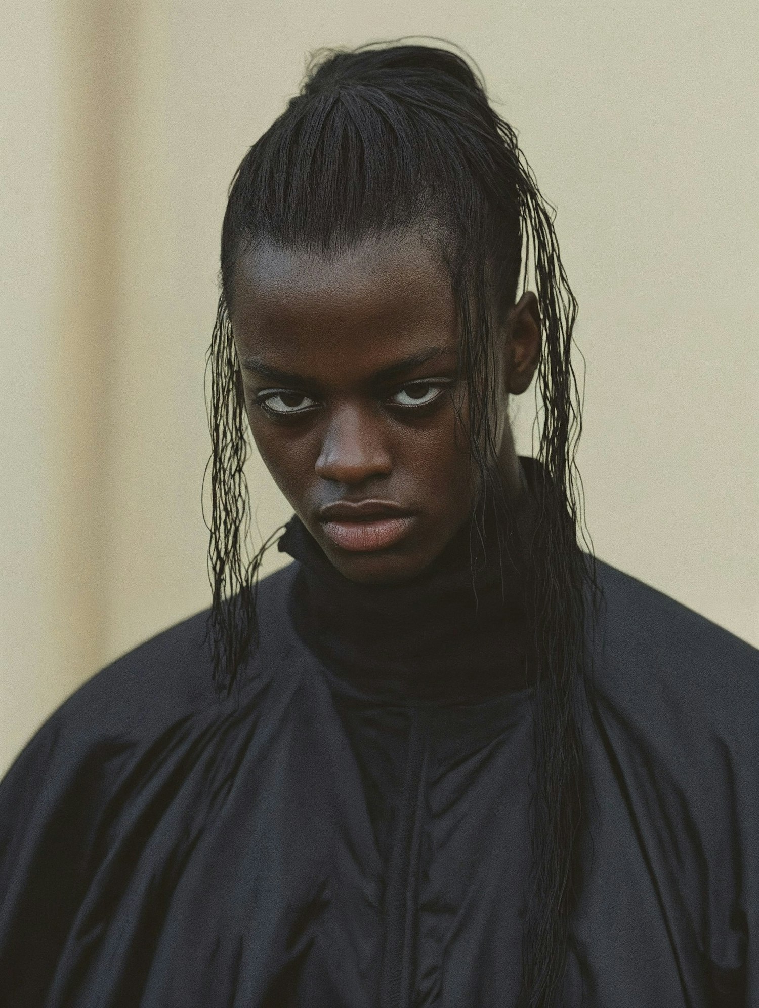 Striking portrait of a person with sleek hair and intense gaze, wearing a dramatic black outfit against a neutral background.