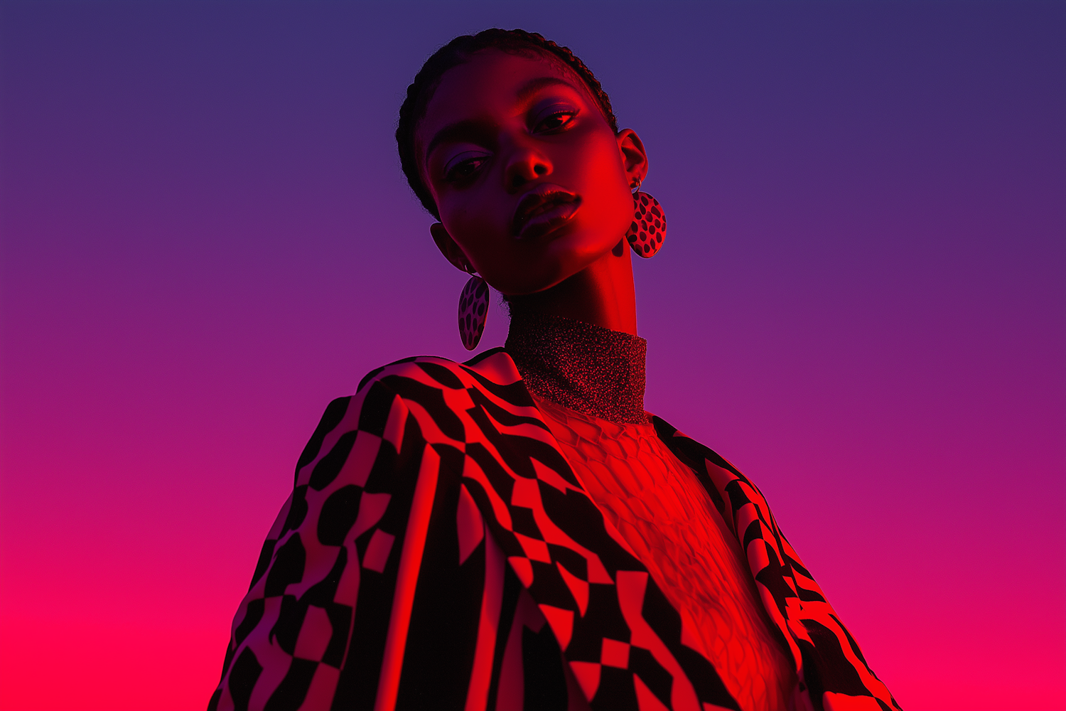 Bold portrait of a woman in geometric fashion, glowing under dramatic red and purple lighting with a vibrant gradient background.