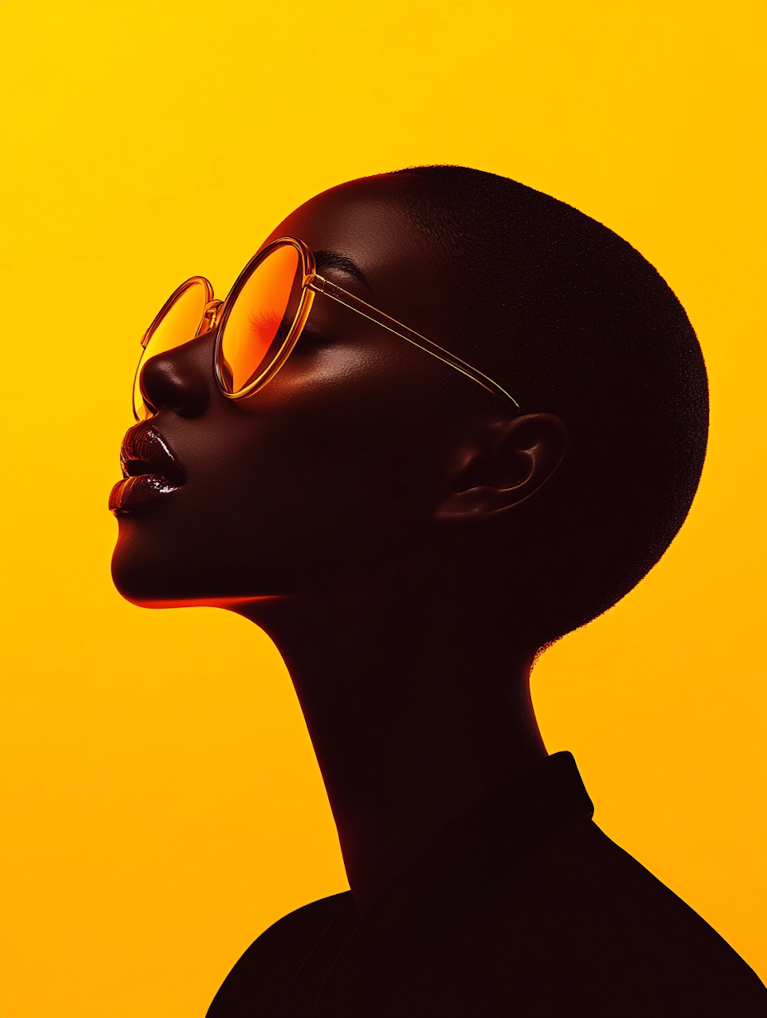 Bold portrait of a woman in orange-tinted sunglasses against a vibrant yellow background, showcasing sleek style and striking lighting.
