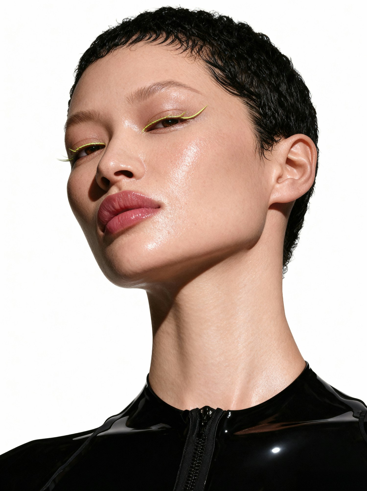Close-up of a person with bold yellow eyeliner, radiant skin, and a glossy black outfit, set against a clean white background.