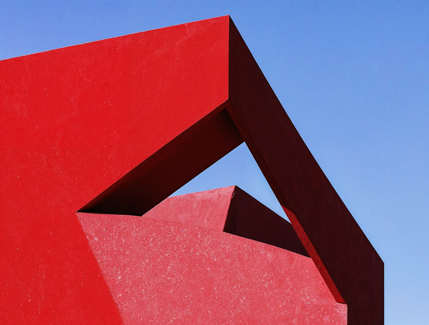Bold red geometric architecture with sharp angles contrasts against a clear blue sky, creating a striking modern and abstract design.