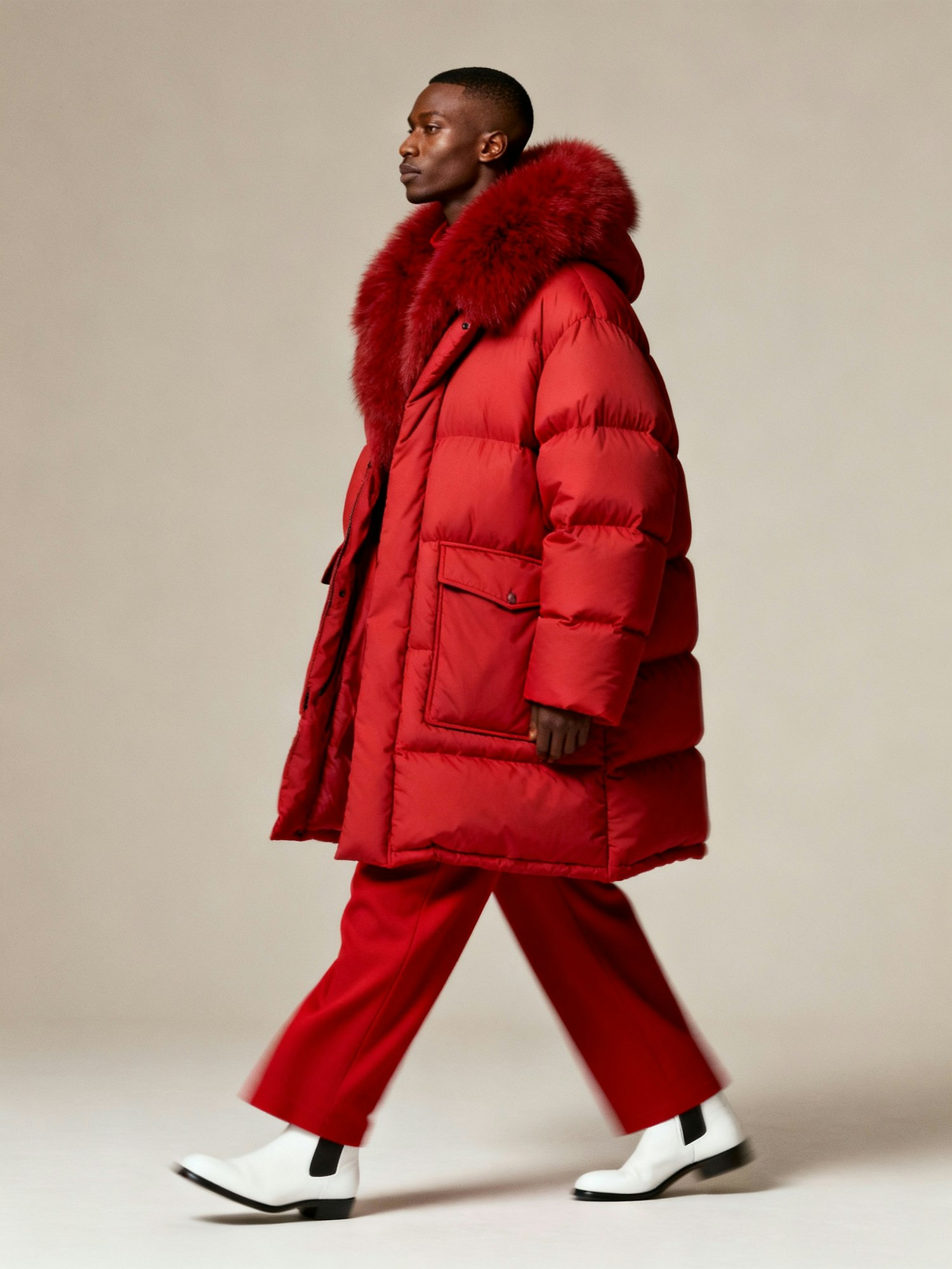 Stylish individual in a bold red coat with fur trim, matching trousers, and white boots, walking confidently against a neutral background.