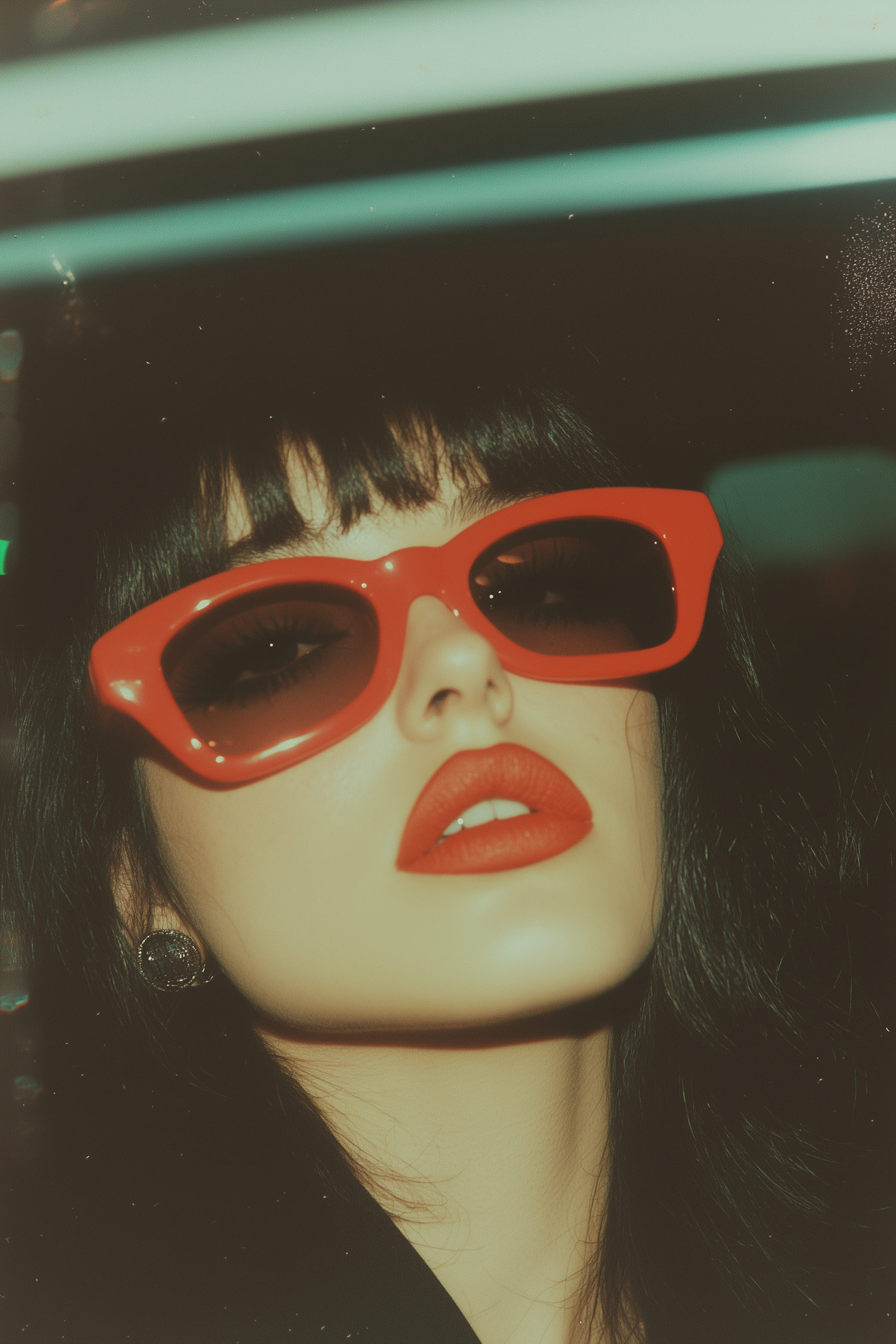 Stylish woman with red sunglasses and lipstick, exuding confidence and elegance. Close-up portrait with a blurred background.