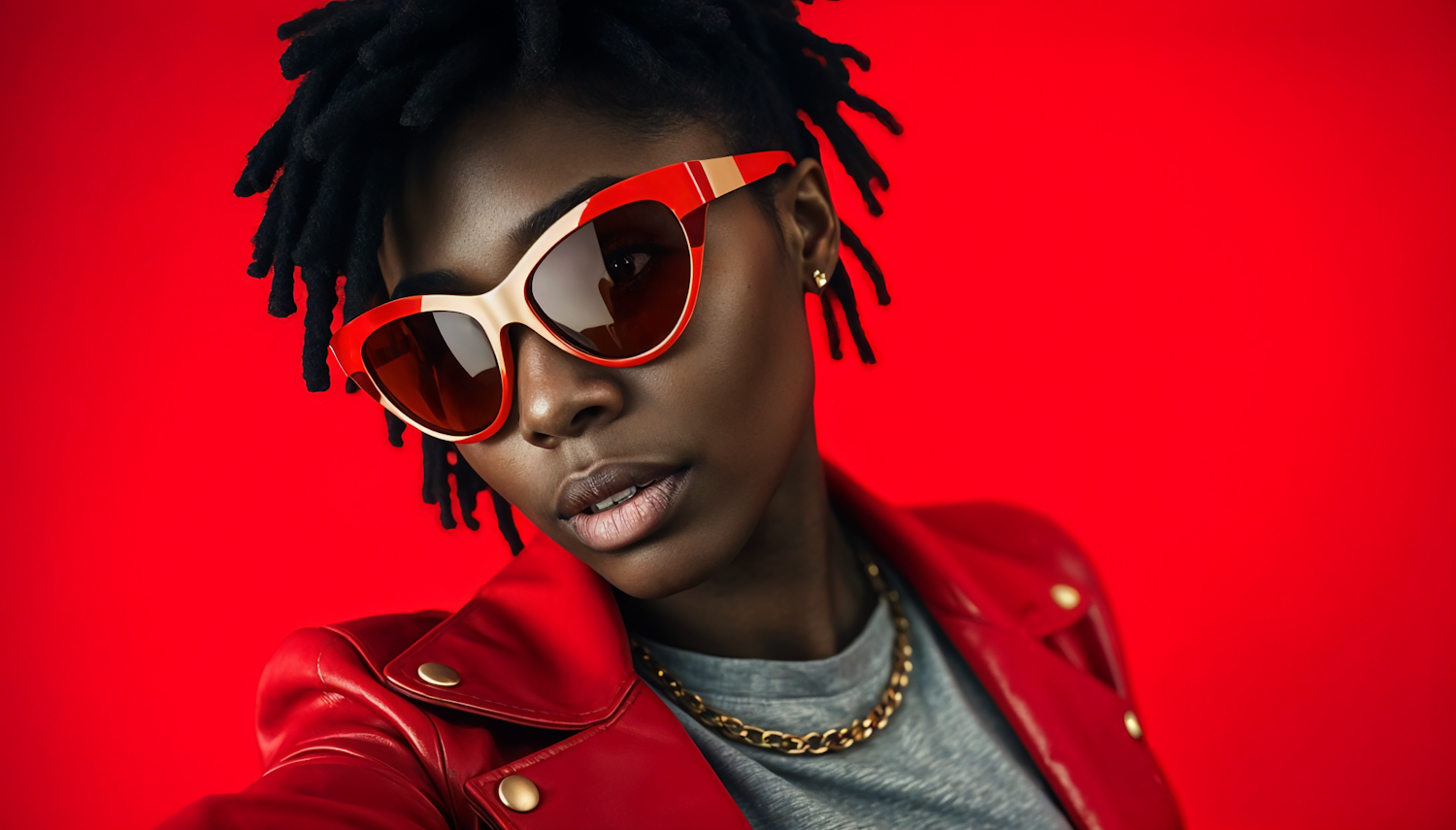 Stylish woman in red sunglasses and leather jacket against a vibrant red background, exuding confidence and modern fashion.