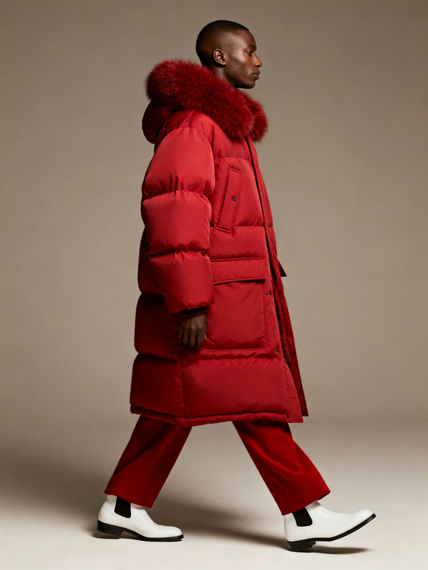 A close-up editorial portrait of a poised Black man wearing an oversized red puffer coat with a voluminous fur collar, large sleeves, and deep pockets. with a skin fade haircut, he pairs it with loose-fitting red pants and white Chelsea boots. The framing is tight, emphasising his glowing, hyperrealistic skin and serene expression. The monochromatic outfit contrasts beautifully with his rich brown skin tone, while the plain backdrop and soft, diffused lighting highlight texture, volume, and mood. The overall aesthetic is minimalist, winter-forward, and quietly powerful. with a full body motion blur of him walking