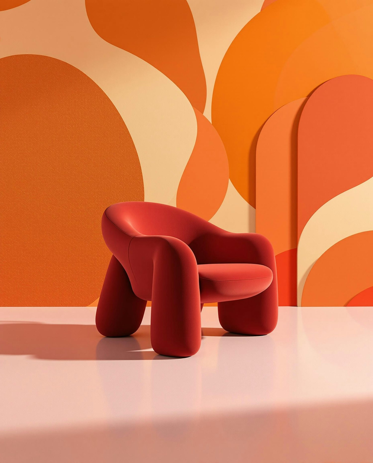 editorial product photo, dramatic studio lighting with soft shadows, carefully styled composition, sculptural object focus, bold modern background in one expressive color, refined materials, high contrast, clean lines, minimal-maximal art direction, luxury design magazine aesthetic a sculptural armchair in matte dark red with thick rounded legs, placed on a light pink concrete floor, background wall with a geometric mural in warm orange and cream
