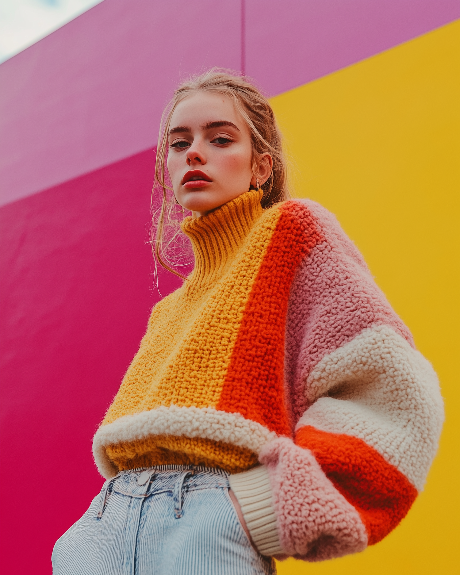 Stylish woman in a colorful knit sweater poses against a vibrant pink and yellow background, exuding confidence and modern fashion.