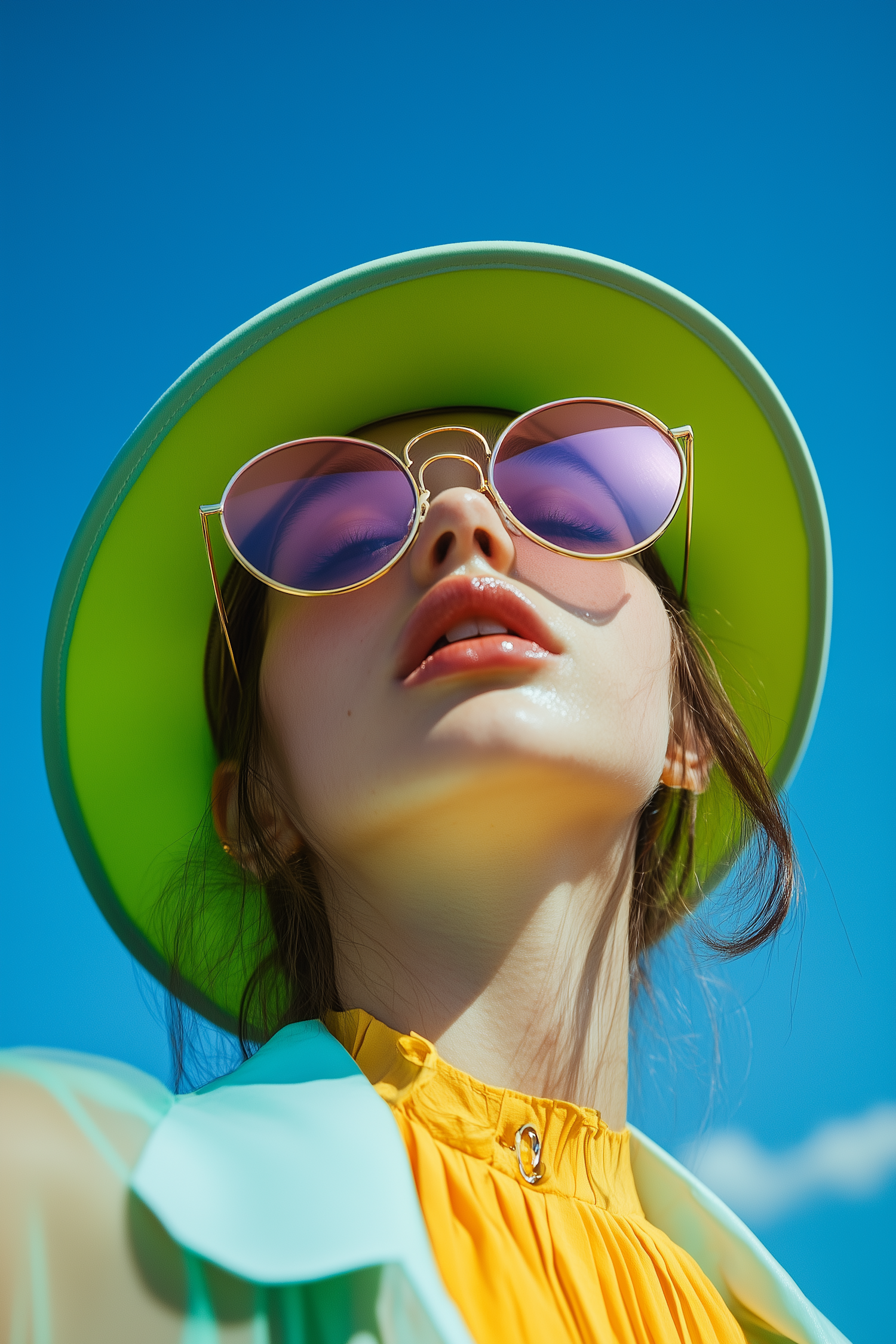 Stylish woman in a lime green hat, reflective sunglasses, and vibrant yellow top against a bright blue sky. Bold summer fashion vibes.