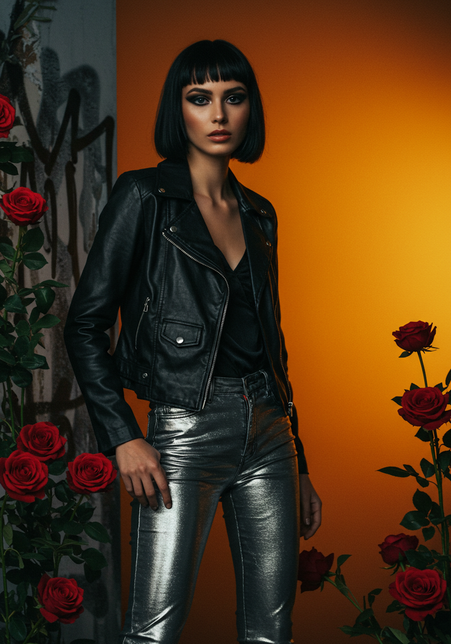 Stylish woman in a black leather jacket and silver pants poses with red roses against a bold orange background.