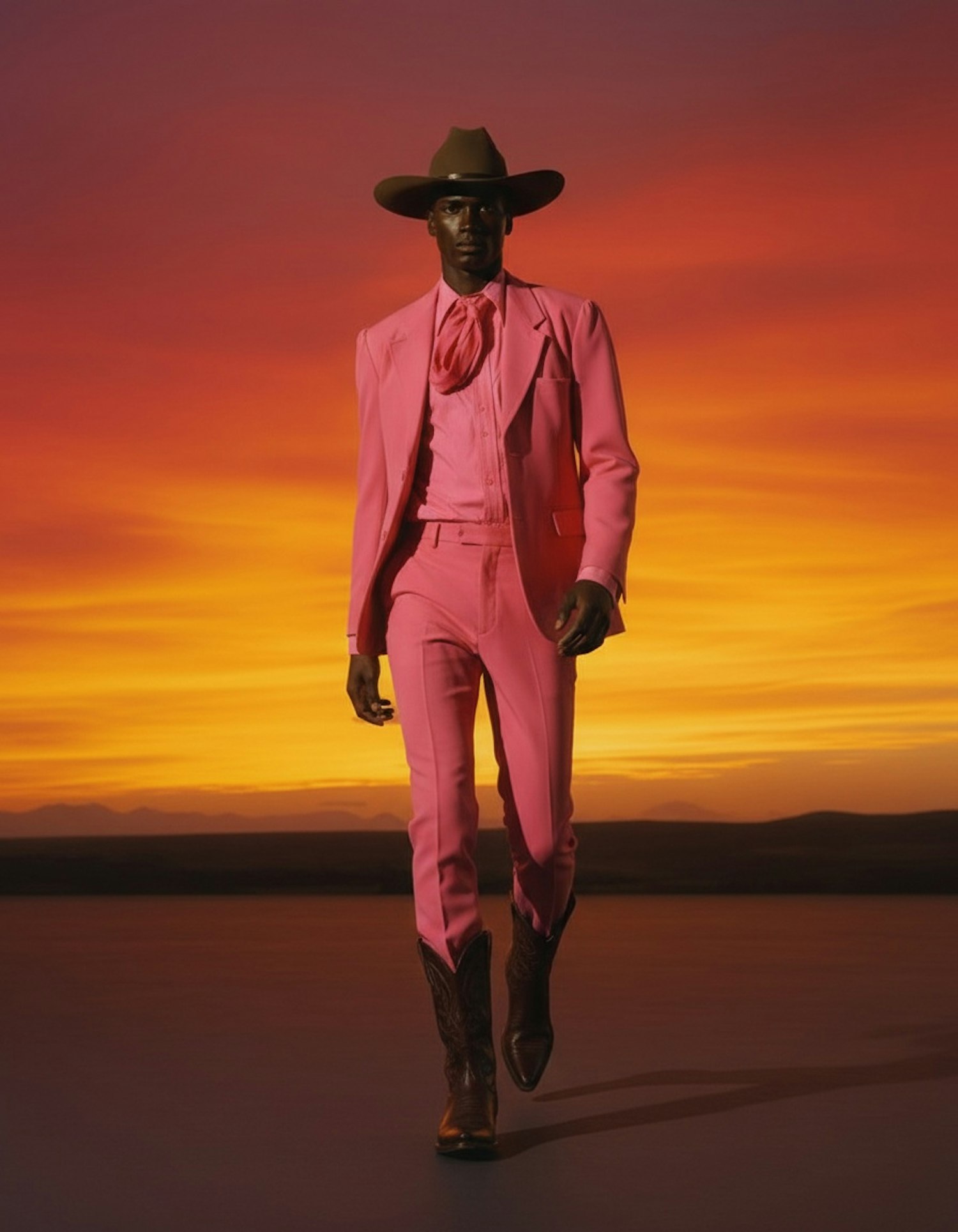 A man in a pink suit and cowboy hat walks against a vivid sunset, blending modern fashion with Western style in a striking visual.