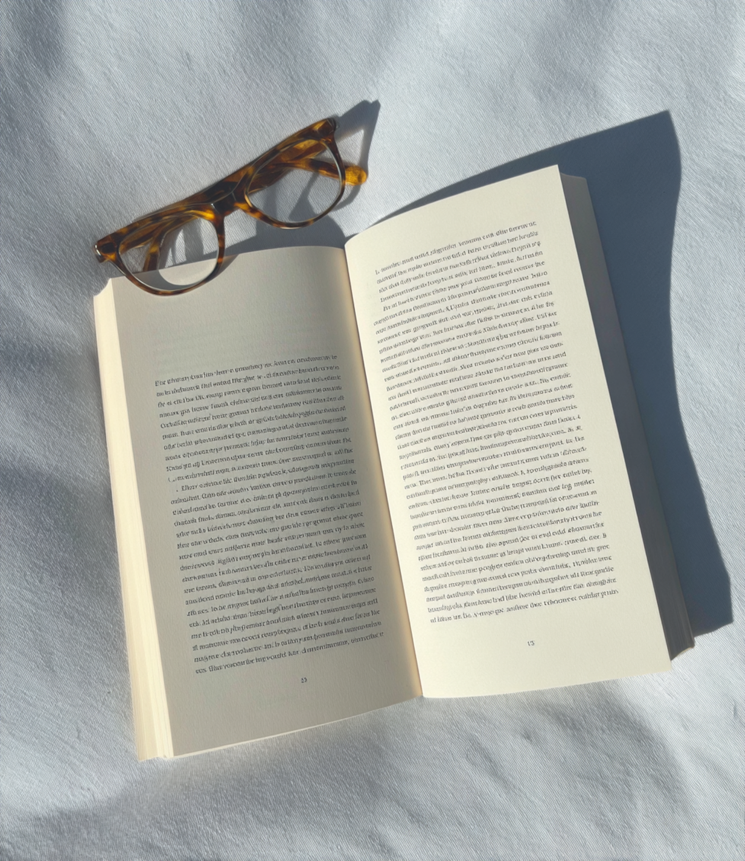 An open book with tortoiseshell glasses resting on it, bathed in soft sunlight on a white fabric background.