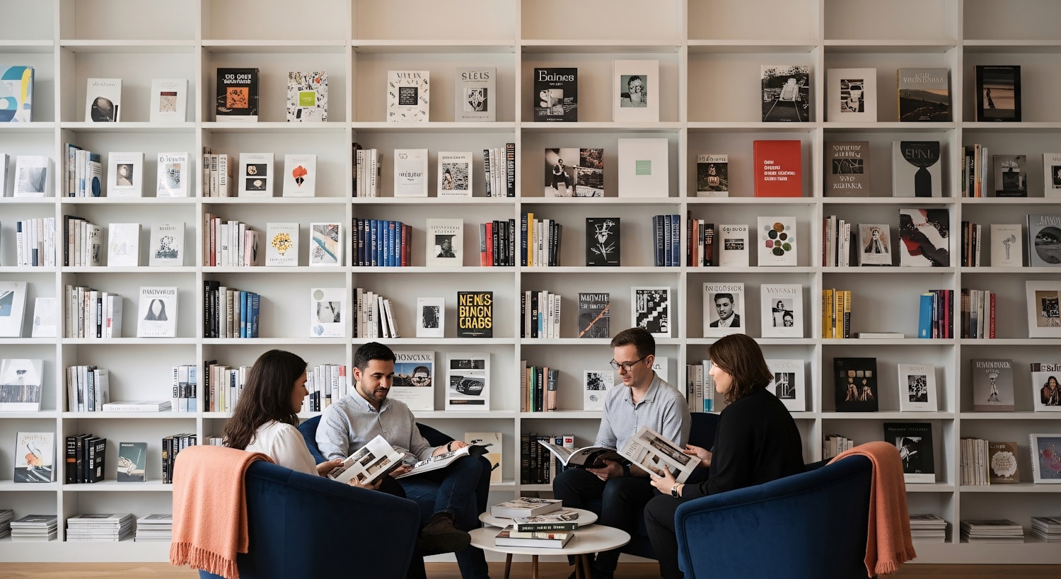 A cozy library scene with four people reading and discussing books, surrounded by a large, organized bookshelf filled with colorful titles.