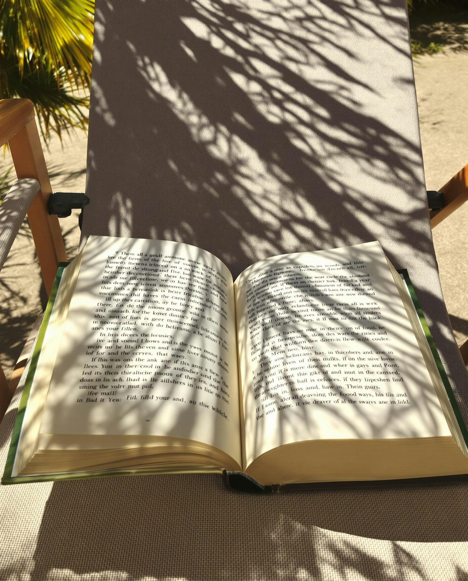 Open book on a lounge chair with palm leaf shadows, creating a serene outdoor reading vibe in warm sunlight.